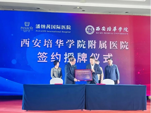 On January 22nd, the signing and plaque awarding ceremony of PANACEE International Hospital, affiliated with Xi’an Peihua University, was grandly held in the Beidaihe Life and Health Industry Innovation Demonstration Zone. PANACEE International Hospital President Liu Guangxian, General Manager Wang Yan, Xi’an Peihua University Hospital President Li Xujun, Health Management Center Director Liu Xiaoling and other related leaders attended the ceremony.