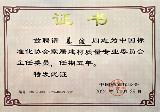 The Chairman of the Board of XPHU Jiang Bo has been appointed as Director of China Association for Standardization's Home Furnishings and Building Materials Quality Committee