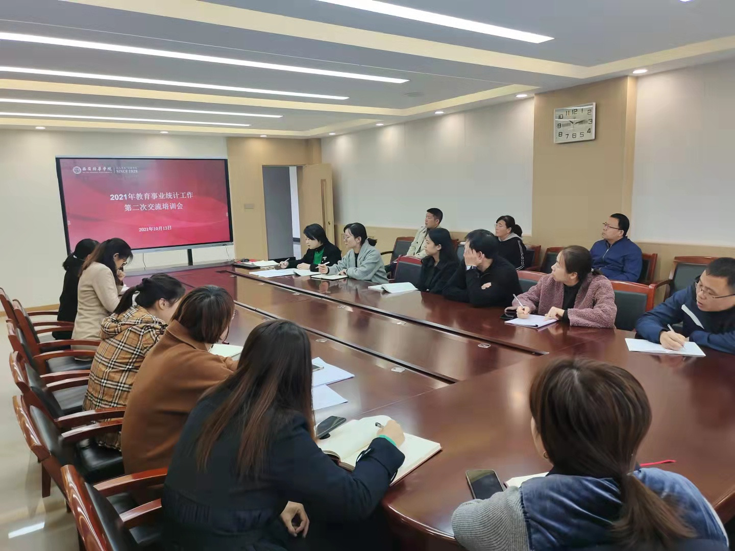 10月13日上午学校就2021年“教育事业统计”、“教学状态数据采集”工作进展情况,在第二会议室召开了各职能部门统计工作人员交流培训会。会议由发展规划与质量建设中心主任助理全婧老师主持,教务管理中心、人力资源中心、招生与就业指导中心、财务与资产管理中心、科研管理中心、学生服务中心、图书馆等职能部门及相关二级学院参加了会议。
