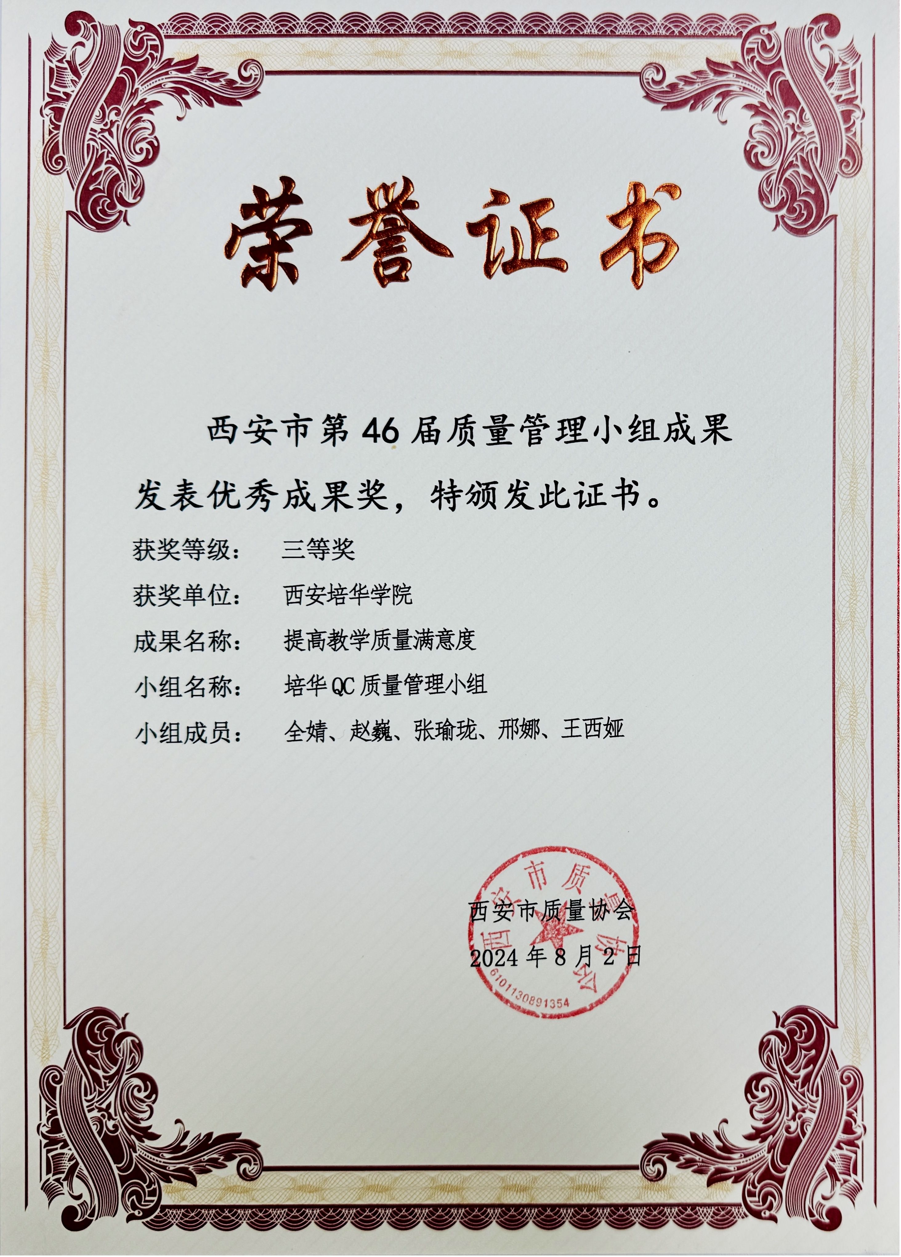 近日,西安市市场监督管理局协同西安市科学技术协会、西安市质量协会成功举办了“西安市第46届质量管理小组成果发表暨经验交流会”,我校发展规划与质量建设中心全婧、赵巍、张瑜珑、邢娜、王西娅组成的“培华QC质量管理”小组发表的《提高教学质量满意度》荣获“西安市第46届质量管理小组优秀成果奖”三等奖。该质量提升团队成员深耕教学质量领域,通过调研、分析往届学生教学质量满意度数据,精准剖析目前教学质量存在的问题,实施运行了“一中心五系统双循环”教学质量保障体系,有针对性的开展改进工作。这些措施不仅增强了学生的学习体验感与学习满意度,也有效助推教学质量的稳步提高。该质量管理小组未来将继续致力于加强学校课堂教学、实践教学等方面的质量建设工作。