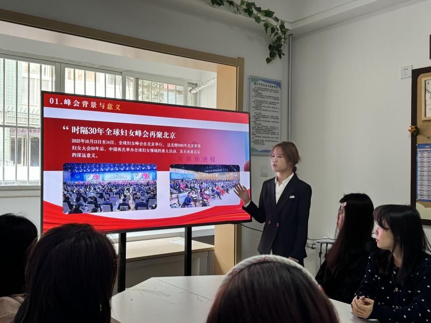 以全球妇女发展进程为切入点,王梦颜同学生动介绍了2025年北京全球妇女峰会的举办背景与深远意义。回顾1995年北京世界妇女大会三十年来,全球性别平等与妇女发展事业取得的瞩目成就,清晰展现了性别平等成为国际社会普遍共识的时代进程。
