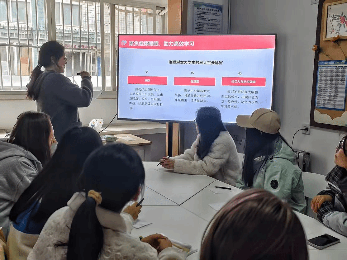 针对女大学生需求,现场开展睡眠科普专场。从颜值、生理健康、学习效率等角度,分享23:00后入睡对皮肤、生理期、记忆力等不良影响,明确7—8小时科学睡眠标准,并分享远离手机法、呼吸放松法、固定起床法3个零成本助眠技巧,强调规律作息优于盲目补觉,为高效学习筑牢身心基础。