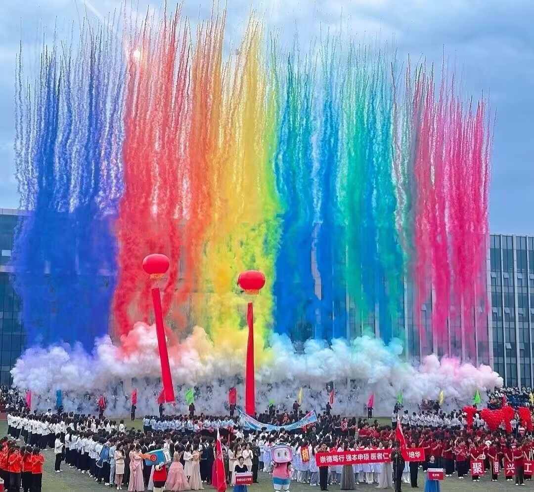 当各学院方阵入场完毕,绚烂夺目的七彩烟花腾空而起,在运动场上空璀璨绽放,将开幕式氛围推向高潮。掌声、欢呼声与烟花绽放的声响交织,洋溢着青春的热烈与喜悦。