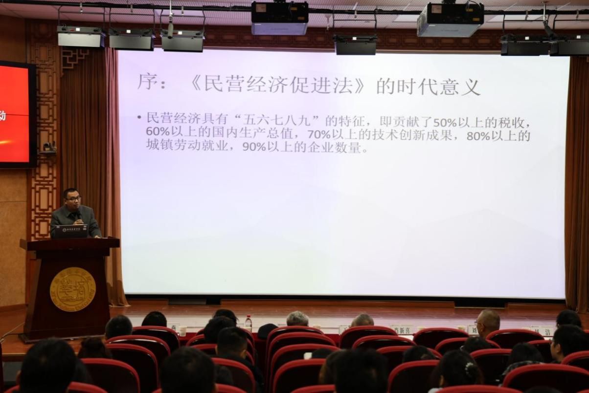 在专题讲座环节,西北政法大学肖新喜教授带来了题为《民营经济促进法解读》的精彩分享。肖教授从平等、全面法治、社会责任三大理论维度剖析法律核心要义。他指出,《民营经济促进法》将“两个毫不动摇”政策上升为法律规范,通过形式平等与实质平等的双重设计为市场主体保驾护航,以“确权+限权”的法治逻辑筑牢民营经济发展根基。
