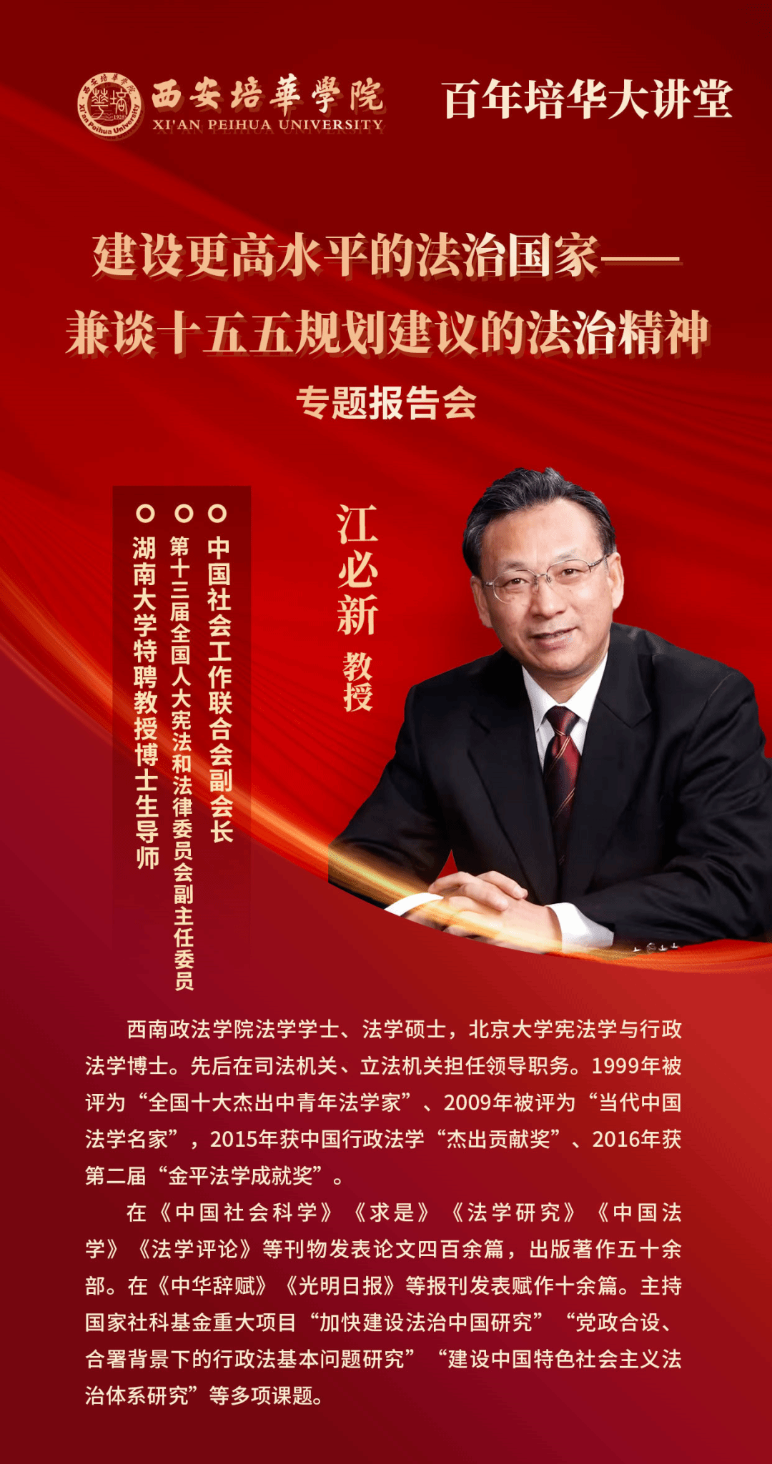 为深入学习贯彻党的二十届四中全会精神,全面落实“十五五”规划建议关于法治建设的决策部署,切实提升师生法治素养和理论水平,12月8日,中国社会工作联合会副会长、第十三届全国人大宪法和法律委员会副主任委员江必新教授应邀来培华,围绕《建设更高水平的法治国家——兼谈“十五五”规划建议的法治精神》主题开展专题报告。《人民法治》杂志社社长兼总编辑梁相斌教授、融媒体编辑张元同志出席活动。学校理事长姜波、党委书记刘锋、副校长罗新远、理事会秘书长姜瀛初、法学院院长王鸿貌及各二级学院师生代表共计400余人参加报告会。报告会由常务副校长胡俊生主持。