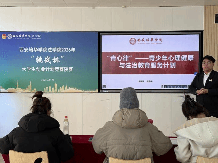 为深入学习贯彻习近平新时代中国特色社会主义思想,凝聚青年力量,引导青年学生聚焦时代痛点,创新创业解决社会热点问题,西安培华学院法学院于2025年11月18日在格物1607、1608教室开展西安培华学院法学院2026年“挑战杯”大学生创业计划竞赛院赛。此次比赛共23个团队参赛,评委由创新创业教研室主任江凤香,法学院理论法教研室教师王悦,法学院团委书记董可怡,团委副书记赵玉洁、铉佳霖担任,由法学院习近平法治思想宣讲团干事王梦颜、刘柏驹主持。