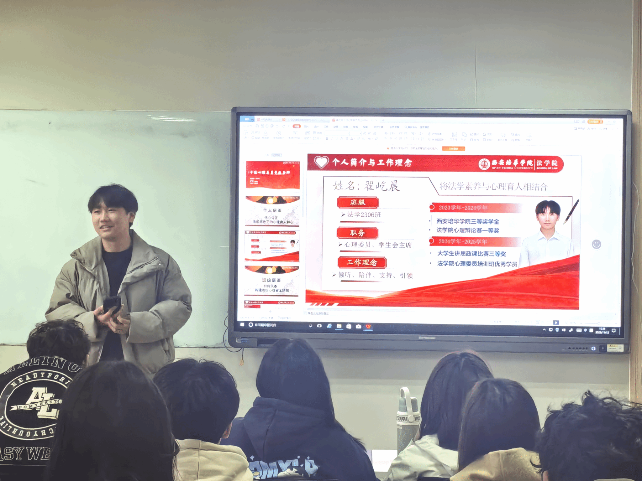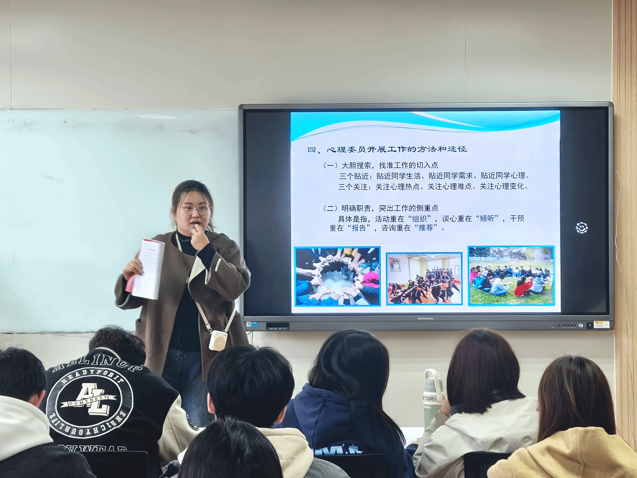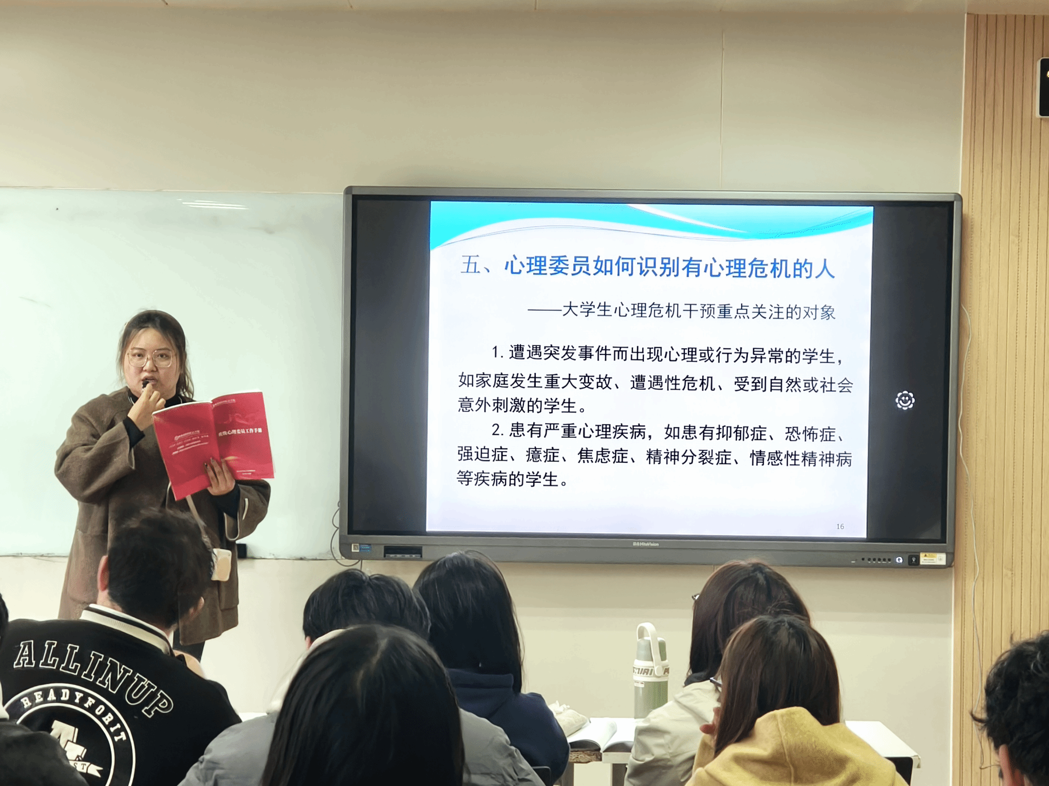 为进一步强化班级心理委员履职能力,完善学院心理健康教育工作网络,切实守护学生心理健康,11月12日,法学院辅导员李月于格物楼1201教室组织开展心理委员专题培训。全院各年级班级心理委员齐聚一堂,共同学习心理健康知识与实操技能。