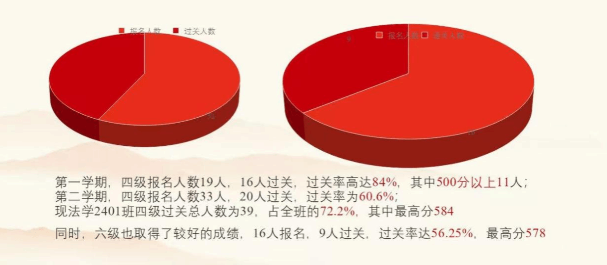 法学2401班作为法学院首届英才班,在学业中取得了一定的成绩。首先是大学英语四六级过关率,第一学期四级报名人数19人,16人过关,过关率高达84%,其中500分以上11人。大一第二学期,四级报名人数33人,过关人数20人,过关率为60.6%。同时,六级也取得了骄人的成绩,16人报名,9人过关,过关率为56.25%。现法学2401班四级过关总人数为39,占全班人数的72.2%。