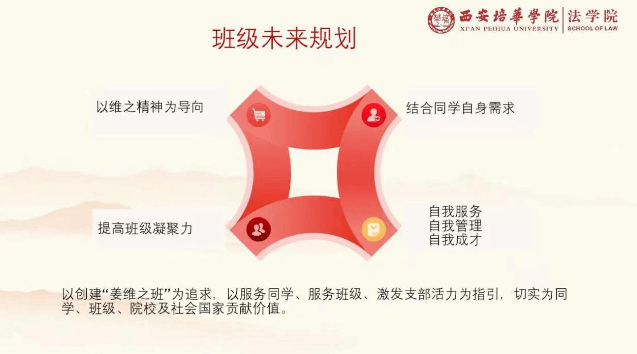 为深入落实立德树人根本任务,深化“三全育人”综合改革,进一步提升大学生思想政治教育的亲和力与针对性,助力学生锤炼“八大能力”,持续推进校风、教风、学风、班风建设。以姜维之先生“立德树人、以文化人”的教育精神为内核,增强班级凝聚力,激励学生践行“明大德、守公德、严私德”的价值观,将个人成长与国家发展紧密结合。