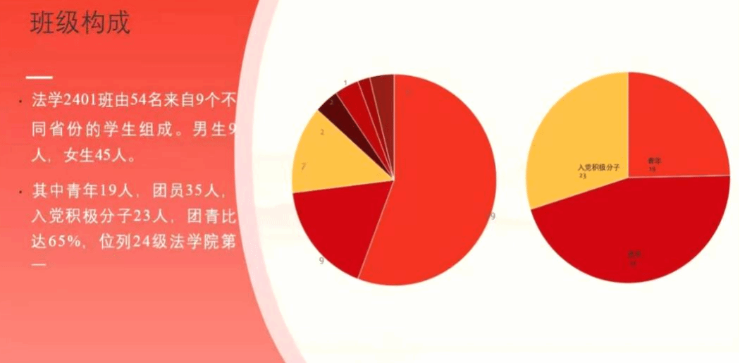 法学2401班由54名来自9个不同省份的学生组成。其中男生9人,女生45人。习近平总书记在庆祝建团百年大会上指出:入队、入团、入党,是青年政治追求的三部曲。班级团员青年积极学习总书记的讲话精神,积极向党组织靠拢。截至目前,班级共有35名共青团员,入党积极分子23名,发展对象2名,其余共青团员与青年也均向组织递交了《入党申请书》。