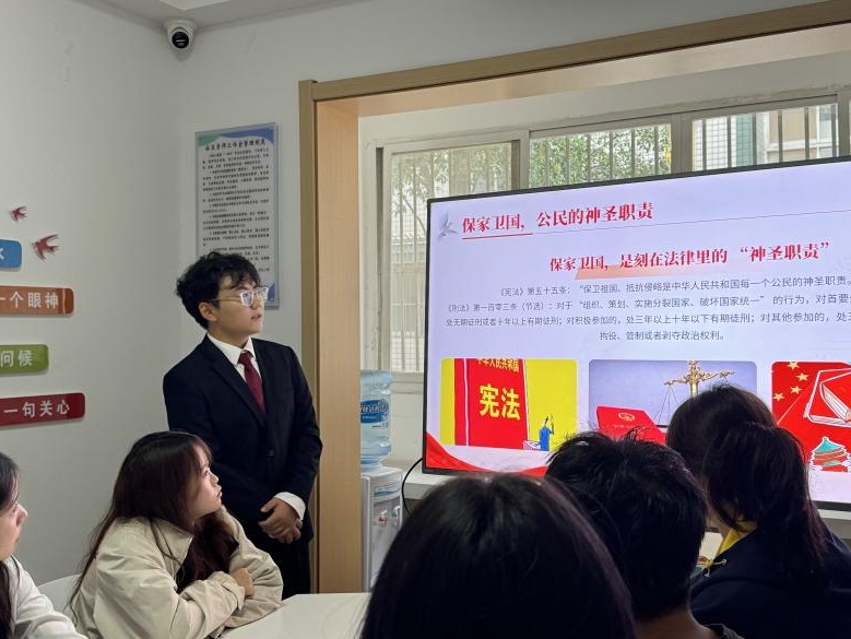习近平法治思想宣讲团成员王江晨同学聚焦国庆的宪法内涵,以“国家象征与公民义务”为核心,解读宪法相关精神,明确爱国是公民法定义务,引导同学们以合法方式庆国庆、表祝福,筑牢爱国守法思想根基。