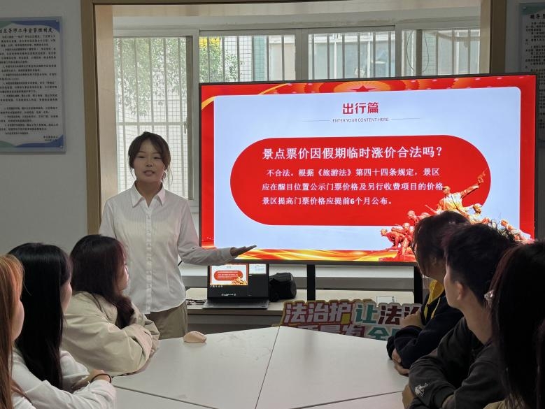 在本次宣讲中,宣讲团成员以法律解析、案例展播、互动式问答等形式,围绕宪法中公民的权利义务以及《旅游法》等热点问题帮助同学们树立了旅游维权观念,强化了人身与财产安全防范意识,为保护大学生的假期财产安全人身安全贡献青年法治力量。
