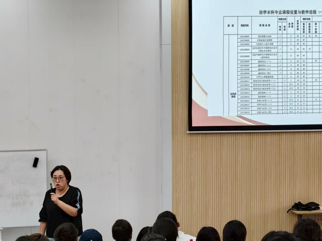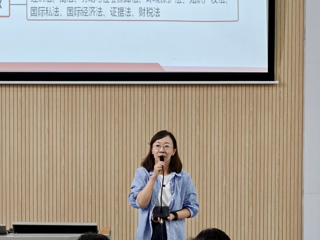 法律实务教研室主任王庆昱详细介绍了法学专业的核心课程和特色课程。从法学基础理论课程如法理学、宪法学、民法学、刑法学等,到实践应用类课程如模拟法庭、案例分析、法律文书写作等,并逐一阐述了每门课程的学习目标和重要性。她讲到,法学学习不仅要掌握扎实的理论知识,更要注重实践能力的培养。通过系统的课程体系学习,新生们将逐步构建起完整的法学知识体系,为未来的法律职业打下坚实的基础。