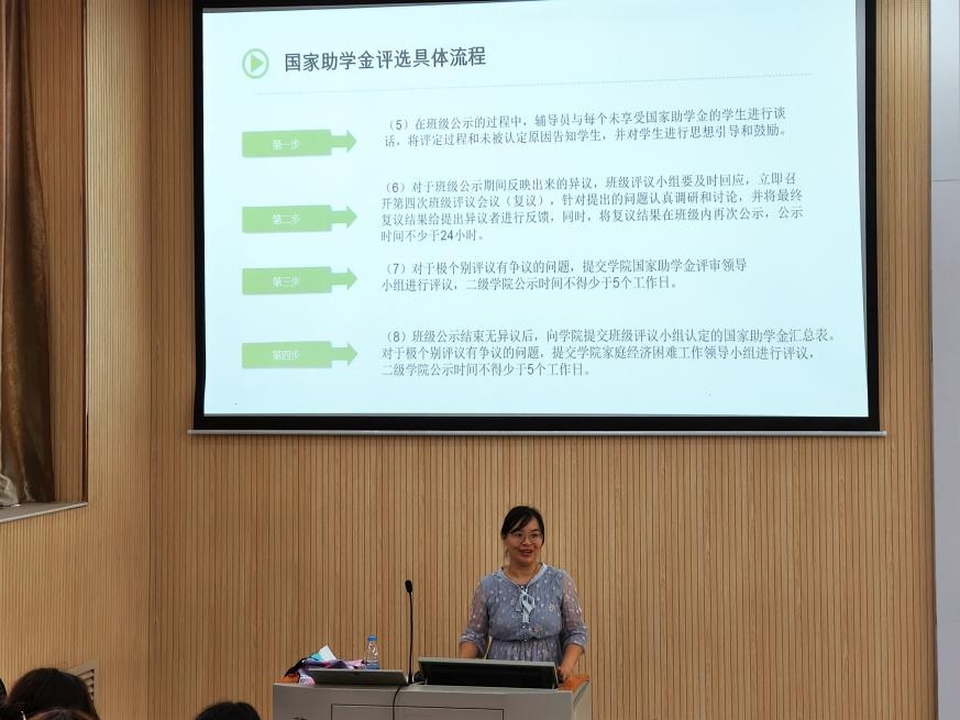辅导员关鑫围绕《资助育人,筑梦未来》这一主题,为新生系统介绍了国家奖学金、助学金、助学贷款等多项资助项目的申请条件与流程。她特别强调学校“不让一个学生因家庭经济困难而失学”的坚定承诺,鼓励家庭经济困难的学生坦然面对困难,积极申请帮扶,将更多的精力投入到学业发展中。