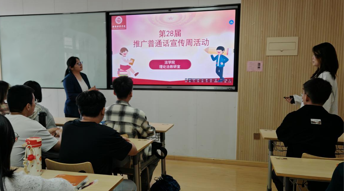 为深入贯彻落实《国家通用语言文字法》,积极响应教育部等九部门关于开展第28届全国推广普通话宣传周活动的号召,2025年9月15日至20日,法学院理论法教研室围绕“加大国家通用语言文字推广力度,促进铸牢中华民族共同体意识”主题,开展了第28届全国推广普通话宣传周系列活动。活动结合法学专业特色,通过经典诵读、主题演讲、模拟法庭等形式,提升师生语言规范意识与应用能力。