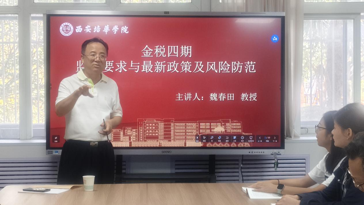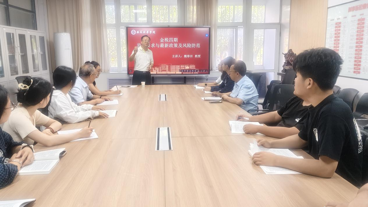 2025年9月16日下午,西安培华学院财税法研究中心在格物楼1116会议室成功举办“金税四期监管要求与最新政策及风险防范”专题讲座。活动由研究中心秘书李雪艳老师主持,法学院院长兼研究中心主任王鸿貌教授、特聘研究员史正保教授及三十余名法学专业师生代表参与研讨。本次讲座特邀研究中心特聘研究员魏春田教授担任主讲人,深度解析金税四期全面实施背景下的税务监管趋势,为企业合规与个人纳税提供实务指导。
