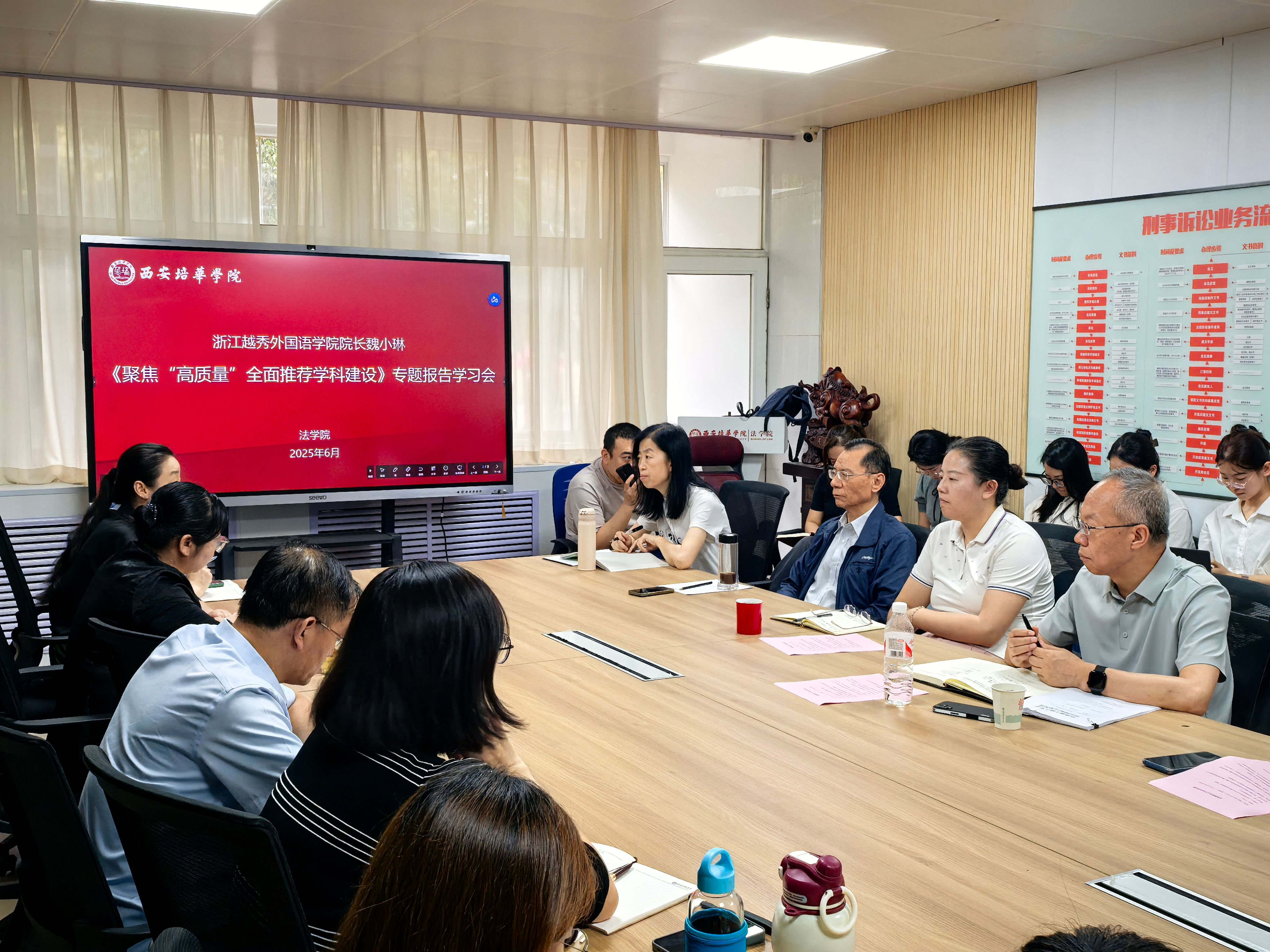 为进一步加强学科建设,汲取先进经验,大力推进申硕工作,法学院于2025年6月18日16:30在格物楼1116会议室召开全体教职员工大会,专题学习浙江越秀外国语学院常务副校长、教授魏小琳《聚焦“高质量”全面推进学科建设》报告精神,并系统部署学院下一阶段核心工作任务。法学院党总支书记兼行政副院长韩斌、副院长赵洁以及全体教职员工出席会议,会议由法学院院长王鸿貌主持。