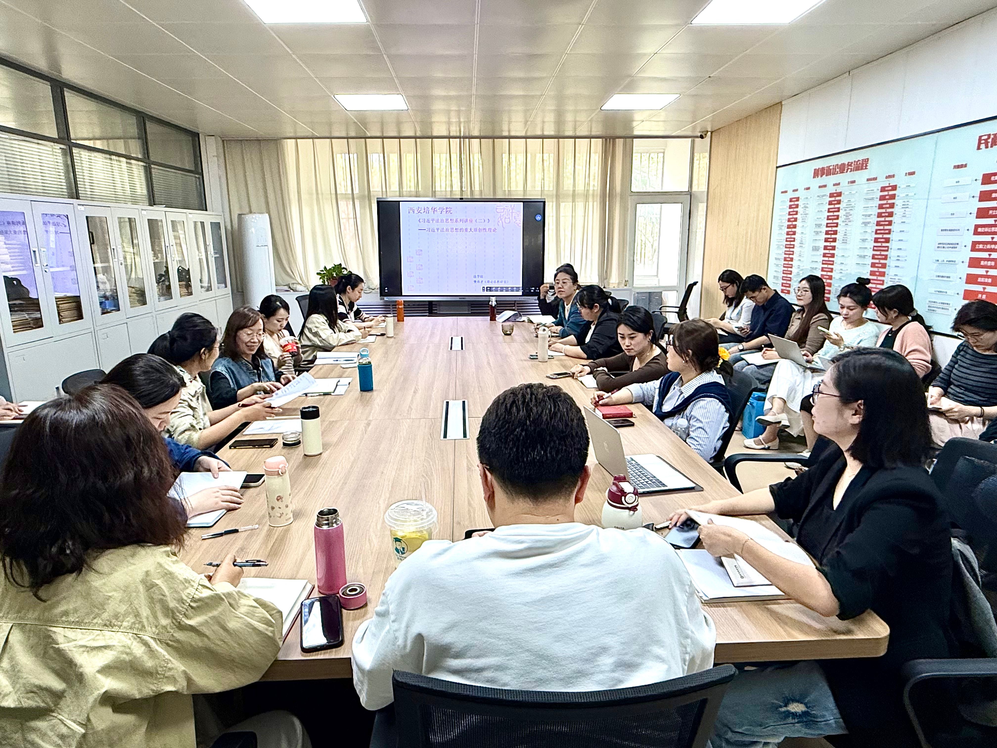 为深入学习贯彻习近平法治思想,将习近平法治思想融入教师的专业教学之中,法学院于2025年4月16日下午在格物楼1116会议室举办了《习近平法治思想系列讲座(二)》,主题为“习近平法治思想的重大原创性理论”。本次讲座由理论法教研室教师樊养才主讲,法学院副院长赵洁、理论法教研室主任罗静以及法学院全体教师出席,本次会议由理论法教研室主任罗静副教授主持。
