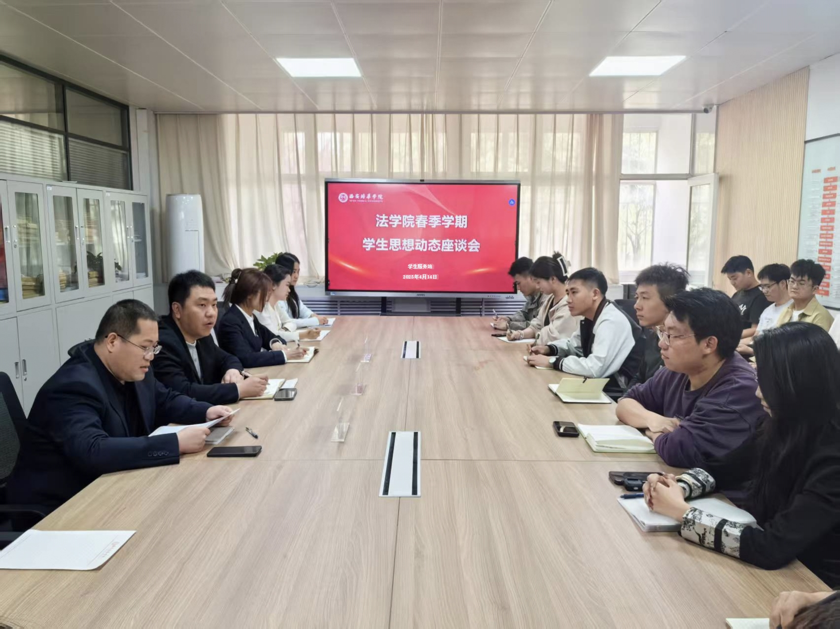 为切实贯彻我校“我为师生办实事”的工作部署,精准聚焦并解决学生关切的热点问题,有力推动学院思政教育工作迈向高质量发展新阶段,法学院于2025年4月14日12:30在格物楼1116会议室召开春季学期学生思想动态座谈会。本次座谈会由法学院学生干事柴成华主持,学院党总支书记兼行政副院长韩斌、团委书记董可怡出席,2023 级与 2024 级学生代表参加。