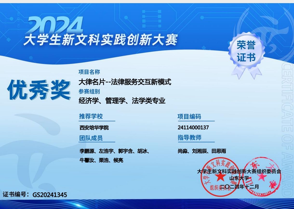 个人主持团队参与2024年全国大学生新文科实践创新大赛“大律名片--法律服务交互新模式”荣获国家级优秀奖,校级一等奖,参与农村自治、法治、德治融合发展路径探析获校级三等奖;在2024年全国大学生职业规划大赛(成长赛道)--让法律之光照耀西部,做公平正义的守护者获得校级一等奖;并在国家级大创“明法一夏法治文化工作室”担任核心成员,大学生互联网+大赛“多元化纠纷解决措施——‘和以解忧’”调解平台构建互联网+项目组成员;