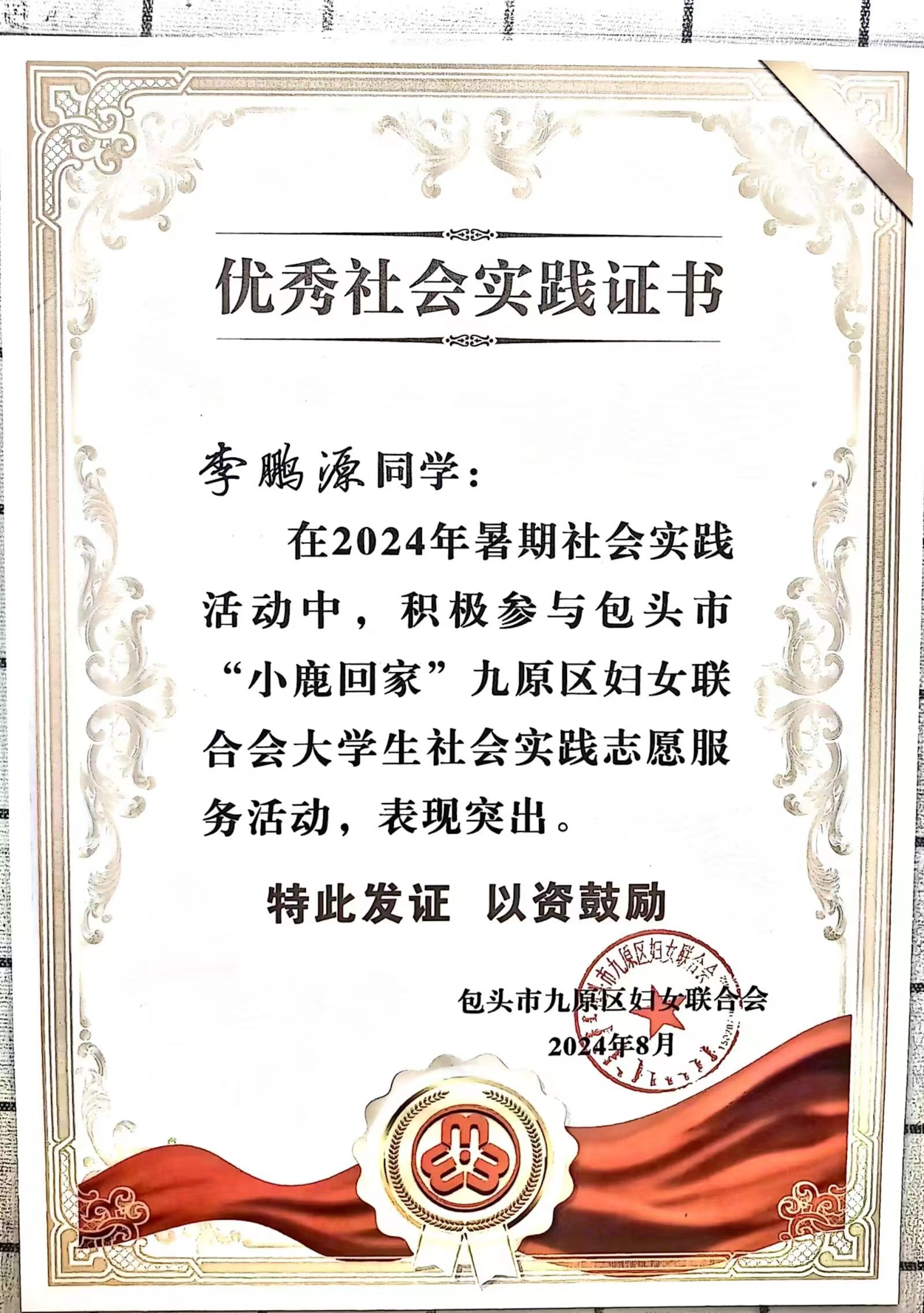 在专业学习的同时,他也践行实干,将专业知识用运到实际生活中,入学两年已有一份专业实习(上海市汉盛律师事务所--律师助理),两份社会见习(内蒙古自治区共青团包头市委员会、包头市九原区妇女联合会),在这过程中不断学习、开阔视野,来弥补自己的不足和激励自己向更加优秀的同辈学习。