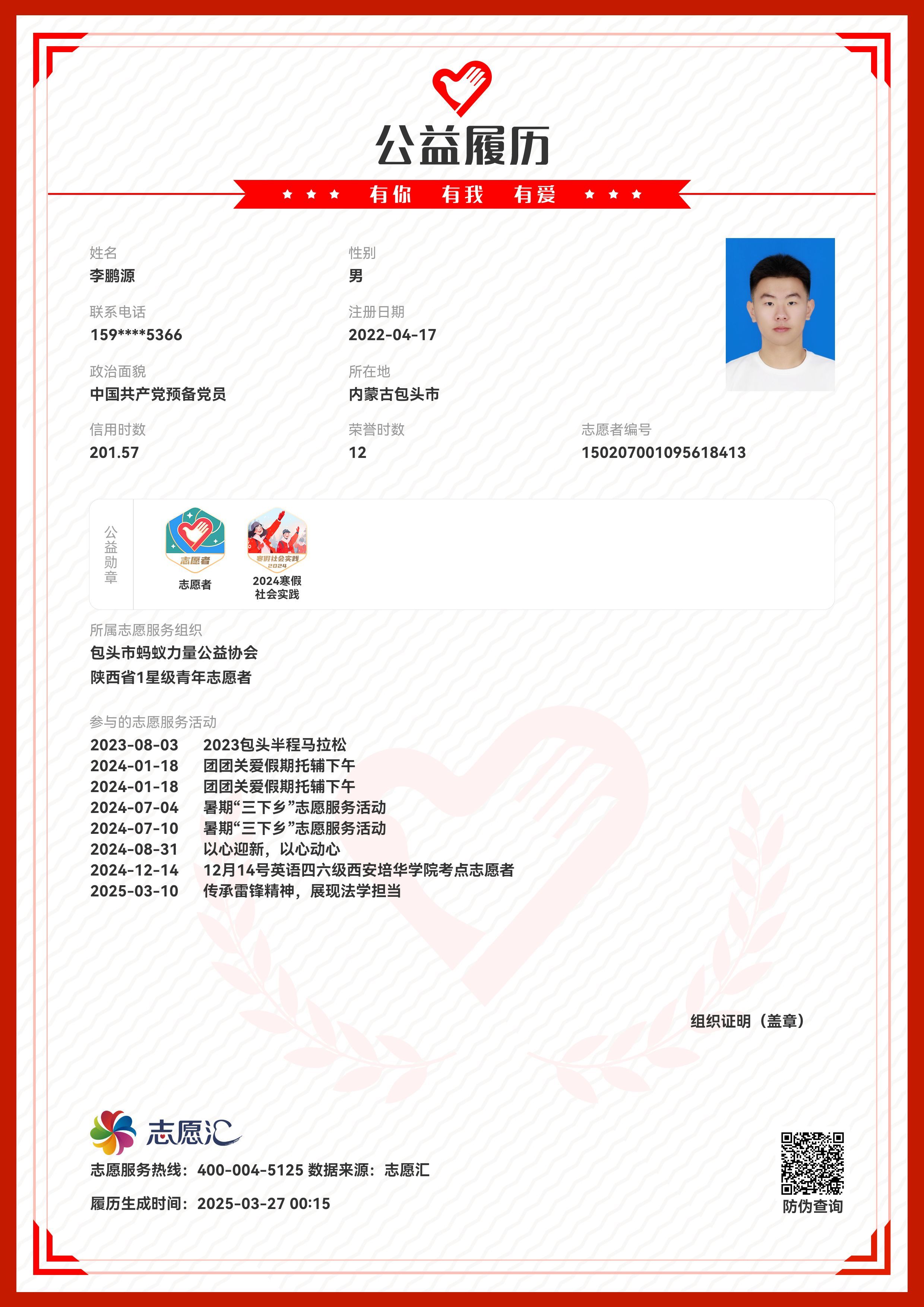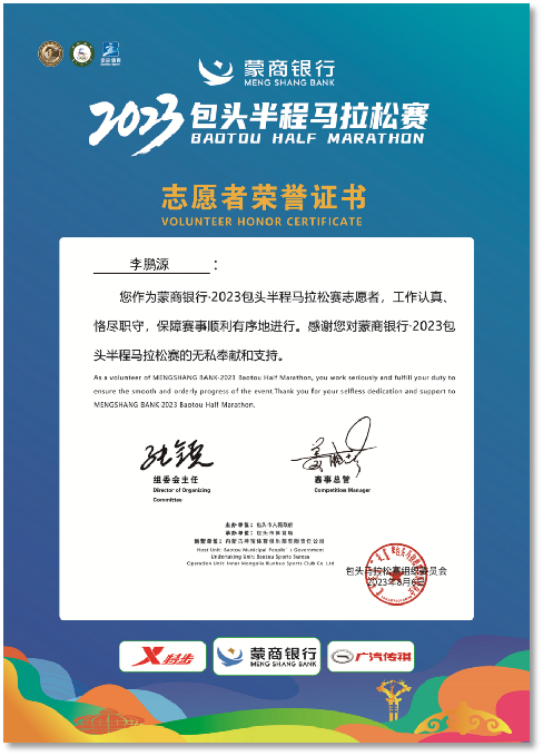 青年的担当不是口号,而是奉献青春,李鹏源同学怀揣着一颗热忱的奉献之心,在志愿的道路上也稳步前行。在日常生活中投身志愿活动20余次,累计志愿时长超200余小时,多次评为“优秀志愿者”展现属于当代大学生的青春风采。