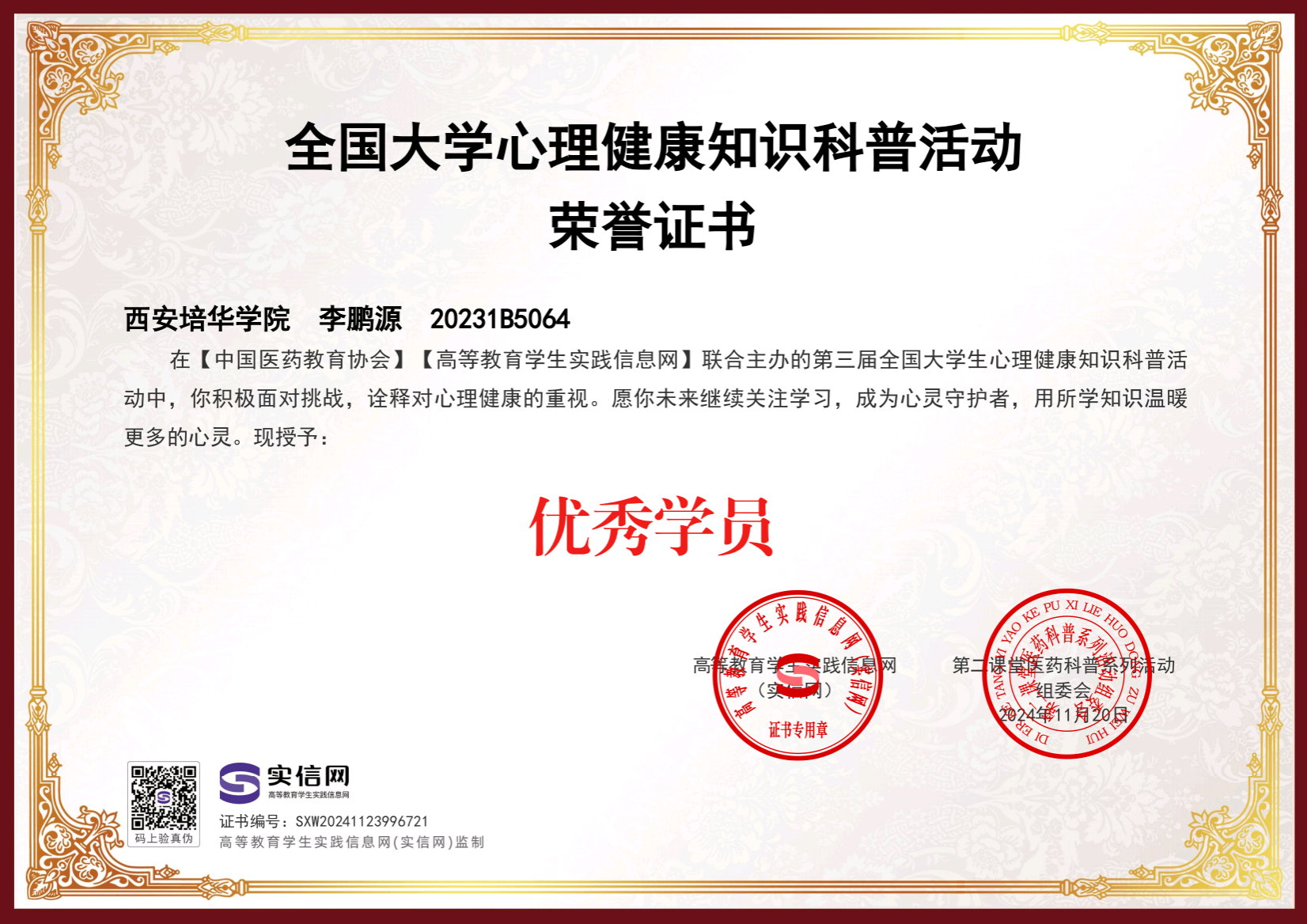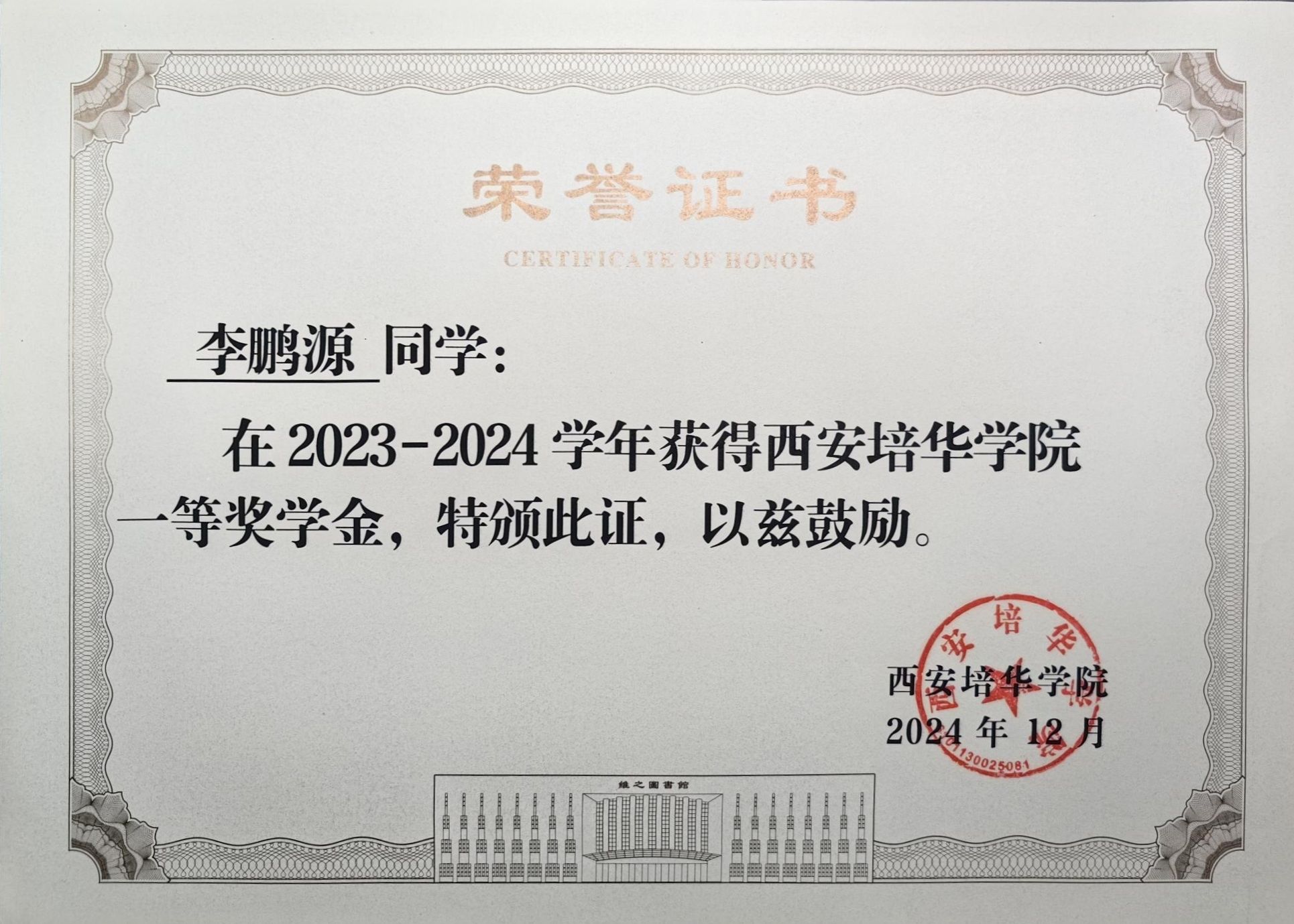 李鹏源,男,中共预备党员,培华奖学金一等奖获得者,法学2308班学生,担任法学2308班班长,西安培华学院教学信息员,考务志愿者协会成员,法学院学生第一党支部负责人,法律服务中心团支书记兼副社长。年级成绩排名前1%,平均分88.74,获得国家级、省级、校级等各项荣誉及证书十余项,并在日常学习生活中注重实践,努力提升自我。