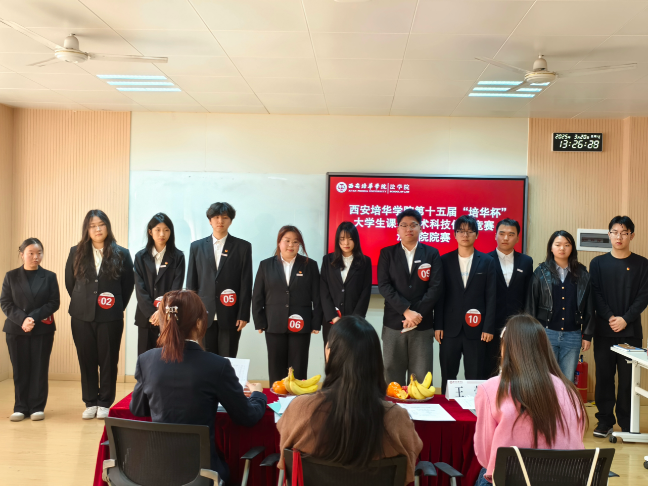 为培养学生的创新精神与实践能力,进一步提升学生的学术水平和综合素质。2025年3月20日12:20,西安培华学院第十五届“培华杯”大学生课外科技学术作品竞赛法学院院赛在格物楼1201教室顺利举行。本次法学院院赛由创新创业教研室主任江凤香、法学院团委书记董可怡以及法学院理论法教研室教师王蕾共同担任评委。经过前期班级评选,11个作品脱颖而出,顺利晋级到院赛阶段。