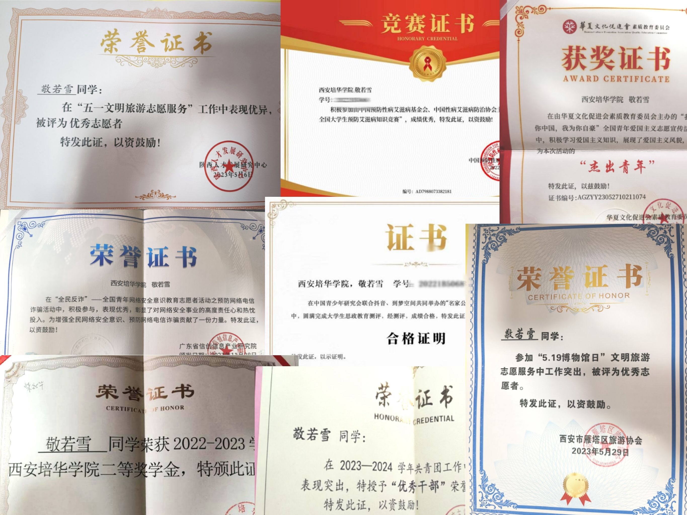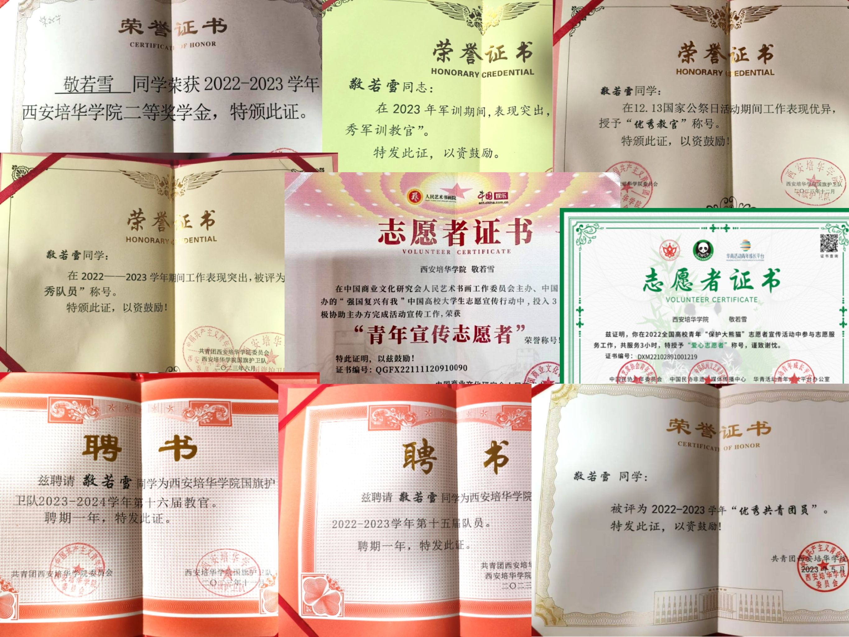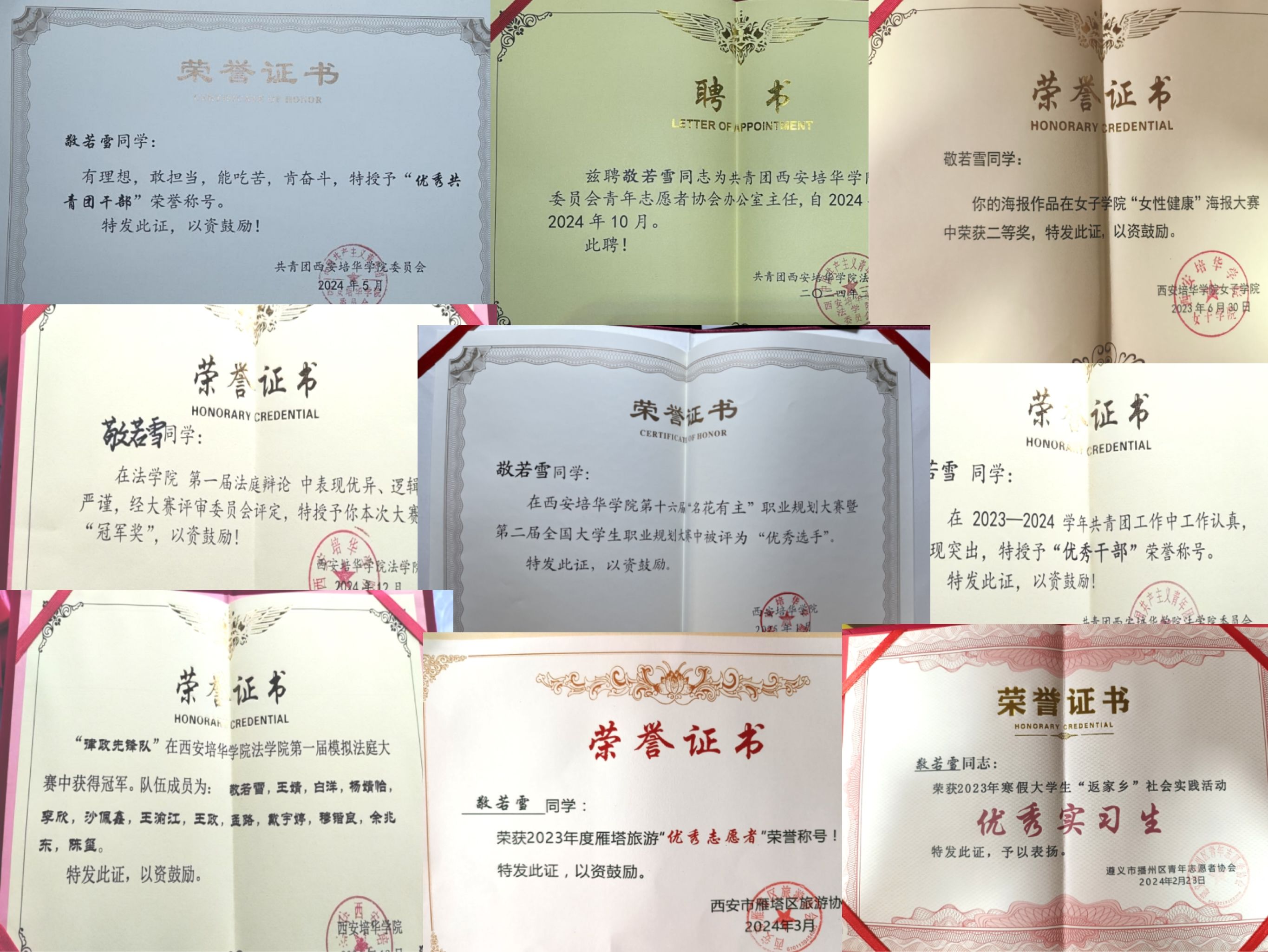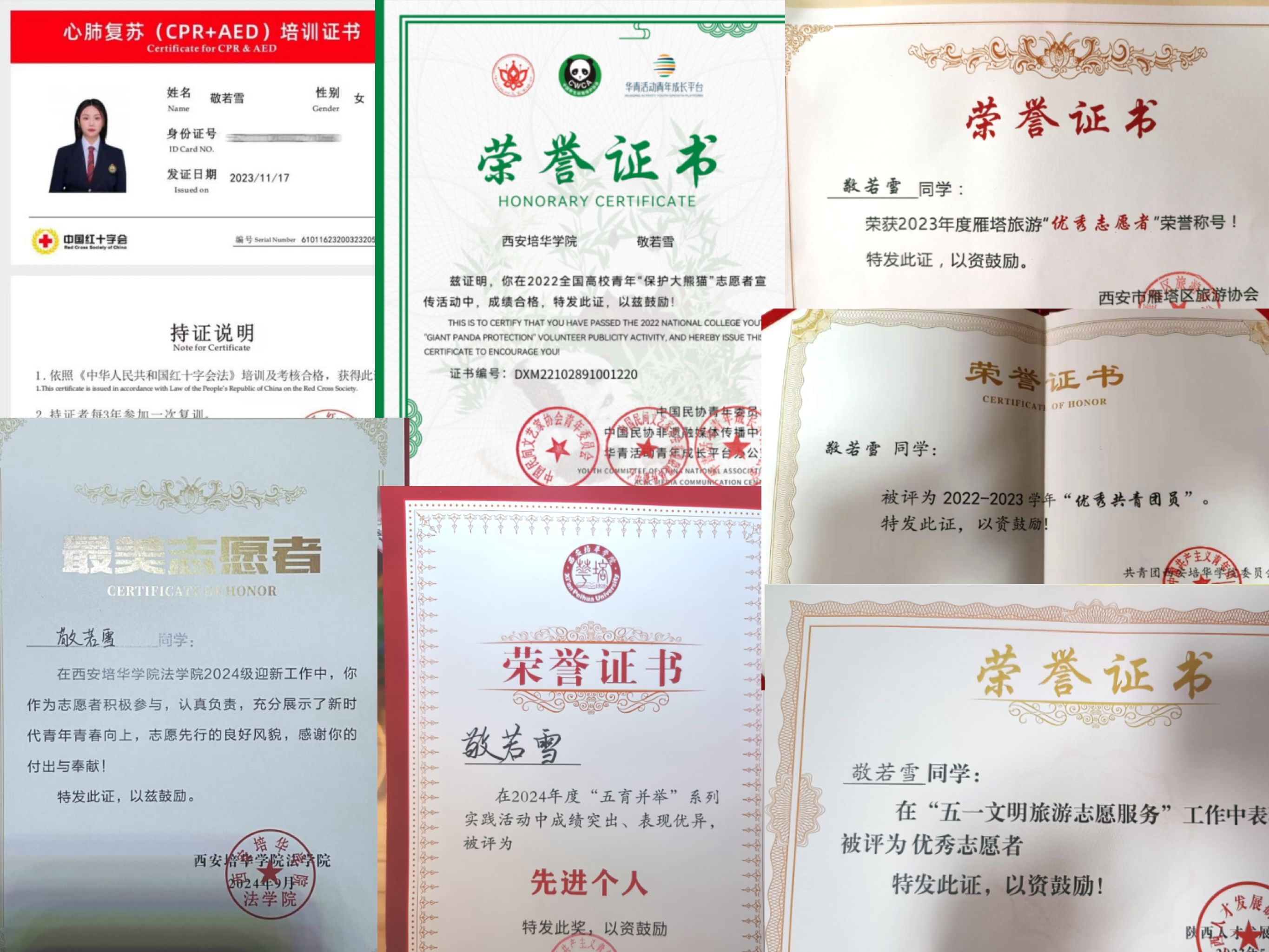 敬若雪,女,汉族,2003年 2月生,中共预备党员。西安培华学院国旗护卫队指导员,西安培华学院学生会主席团成员,法学院学生会主席团成员,法学2202班副班长。曾获西安培华学院优秀共青团员、优秀共青团干部等共青团荣誉,其余各类省市校级奖项共计四十余项。