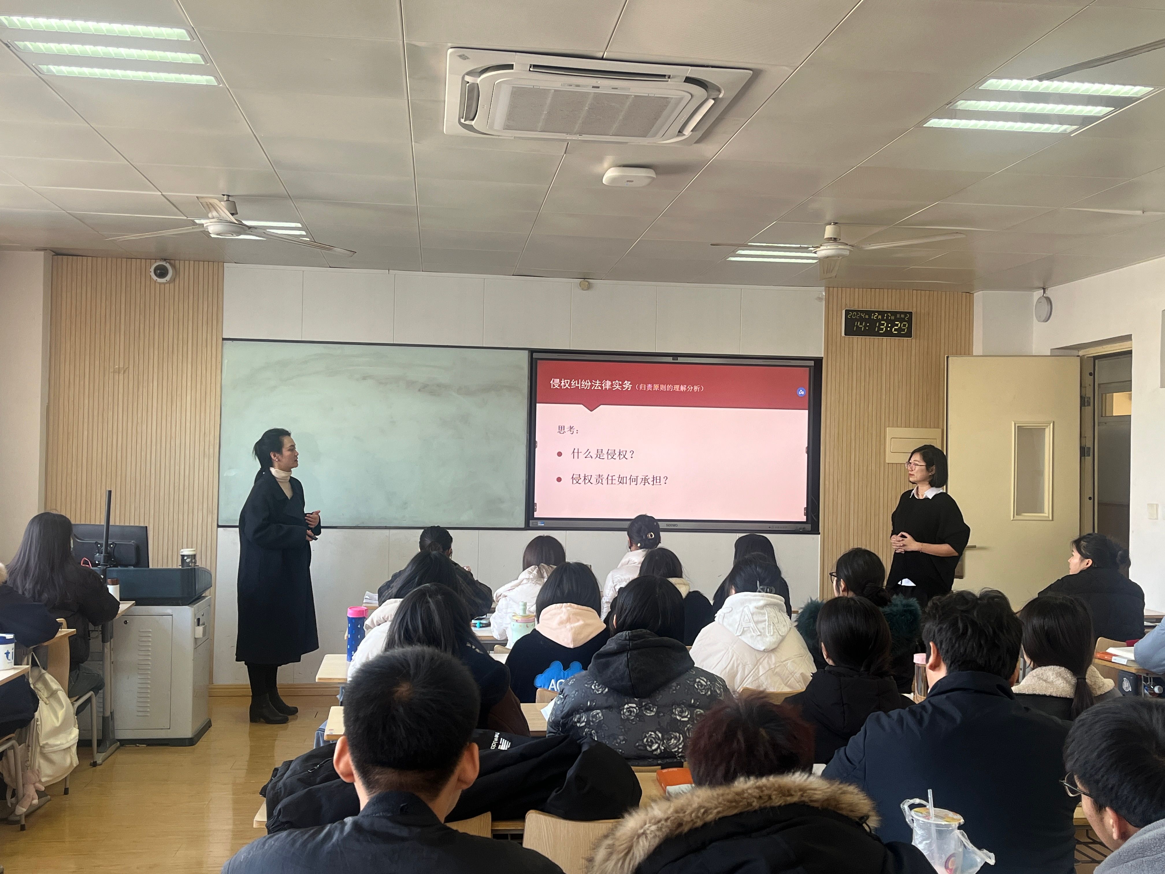 为推动我校应用型课程改革进程,优化协同育人培养模式,提升教学质量和效果,实现理论与实践的深度融合,我院《民法》课程于2024年12月17日下午,开展了“双师同堂”实践教学活动。此次活动特邀请陕西格润律师事务所任宇律师与法学院私法教研室郭淑君老师共同授课,2024级法学(专升本)03-04班学生参加。