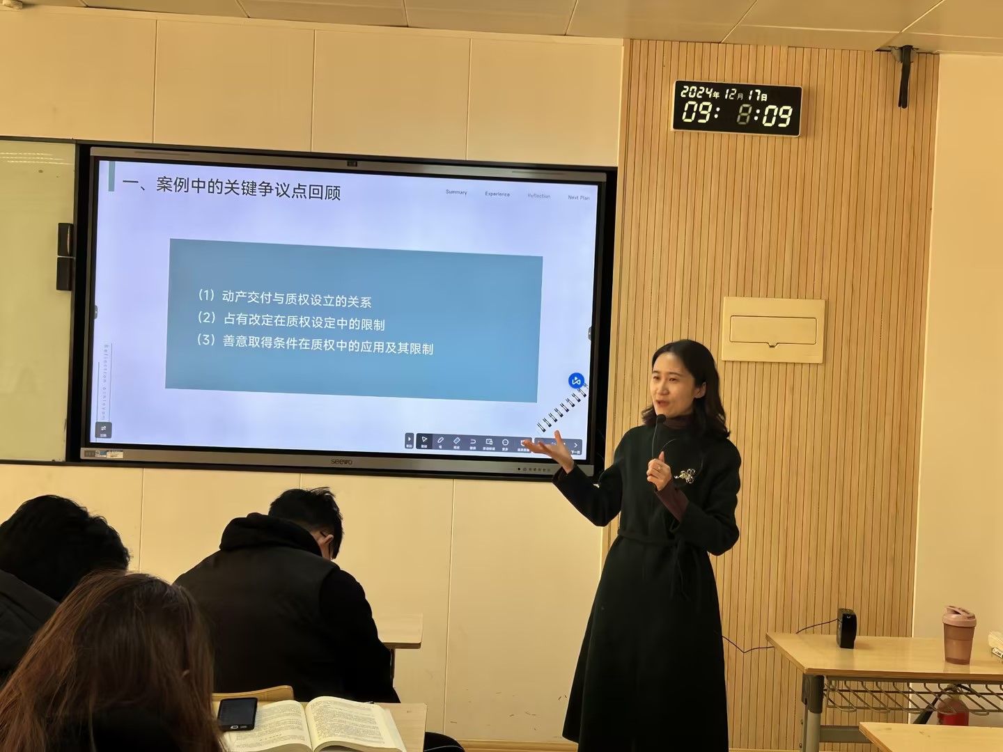 课堂第一部分“质权”基本理论,由高燕老师具体讲解,从质权概述问题出发,主要讲解了动产质权的设立方式步骤:1.签订书面质押合同。2.交付质物(1)交付方式:现实交付+观念交付(简易交付、指示交付);(2)交付效力——质权设立。并结合我国《民法典》第425条的理解和解读,引导学生们思考这些理论在法律实务中的应用思路,为下一阶段律师讲解做理论铺垫。