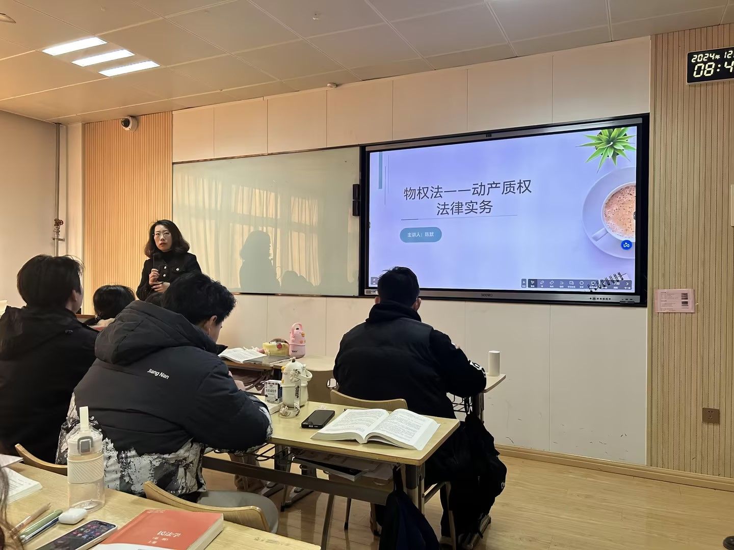 为进一步提升法学专业教学质量和学生实践能力,深化我校应用型课程改革,2024年12月17日上午,法学院开展了物权法课程“双师同堂”教学活动。本次活动,特邀陕西萃泽律师事务所陈默律师(律所创始合伙人),与私法教研室高燕老师进行了“双师同堂”模式授课,为法学2023级01班(学分制)和2023级02班(学分制)的学生,围绕物权法领域理论与实践共同展开教学。