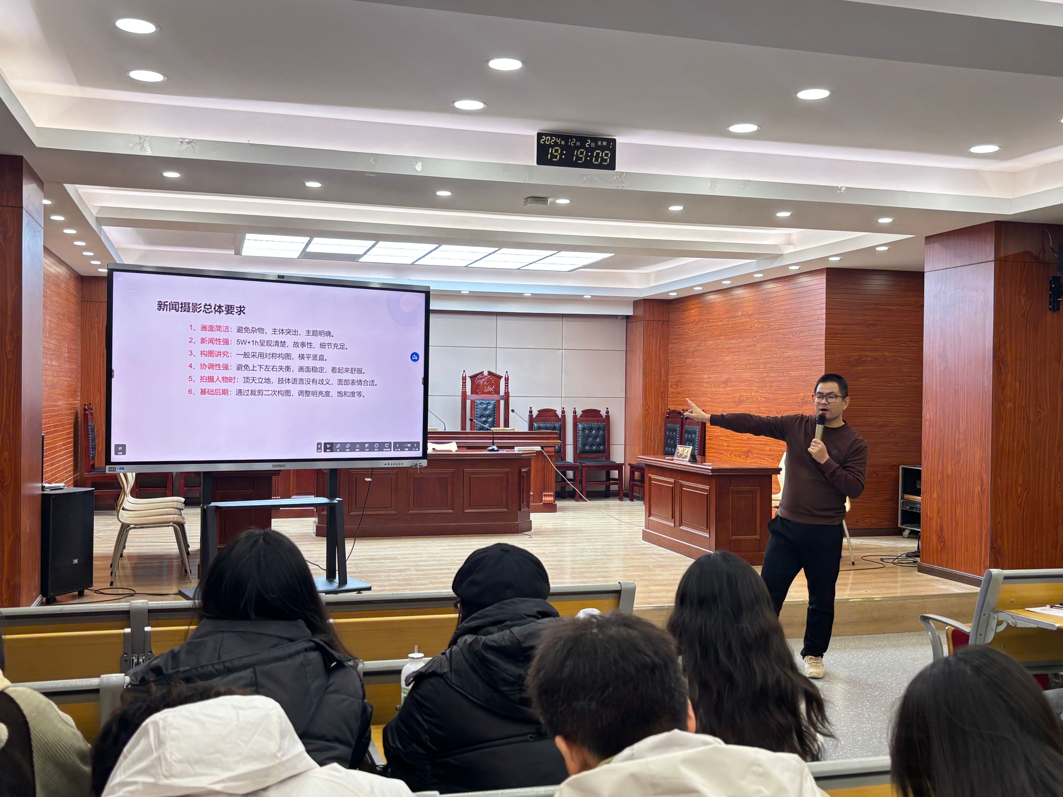 在新闻摄影上,其新闻摄影的总体要求其要求主要分为6点:画面简洁、新闻性强、构图讲究、协调性强、拍摄人物时、基础后期。各班宣传委员认真聆听吕晓东老师的传授,让大家对新闻稿的写作有了更深一步的了解,有利于日后各班公众号的运营。