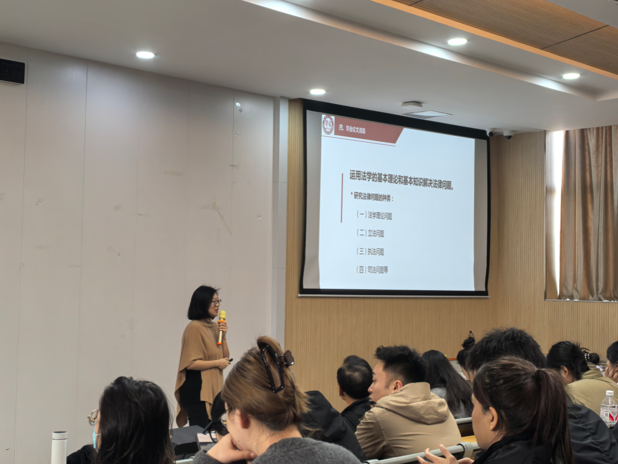 会议伊始,法学院教学副院长赵洁副教授对2025届毕业论文工作进行了全面部署,赵院长围绕我校本科生毕业要求,深入剖析了毕业论文的重要意义。她明确指出,毕业论文是衡量毕业生学习成果以及专业技能的关键标准,学生务必从思想层面给予充分重视,按照时间节点完成论文工作,保证执行过程的严谨性。同时要严格遵守学术规范,坚决维护学术诚信,端正写作态度,积极配合论文指导老师,进行有效沟通。