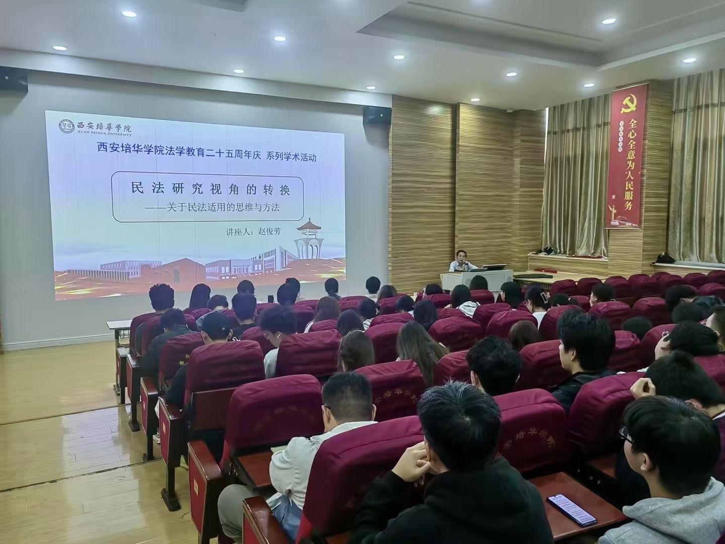 为进一步加强法学教育,提升学生法学思维与能力,西安培华学院法学院于2024年10月18日(周五)14:30,在格物楼J01教室成功举办了一场以《民法研究视角的转换:关于民法适用的思维与方法》为主题的学术讲座,由法学院赵俊劳教授主讲。讲座吸引了法学院众多教师和大一、大二学生的积极参与。