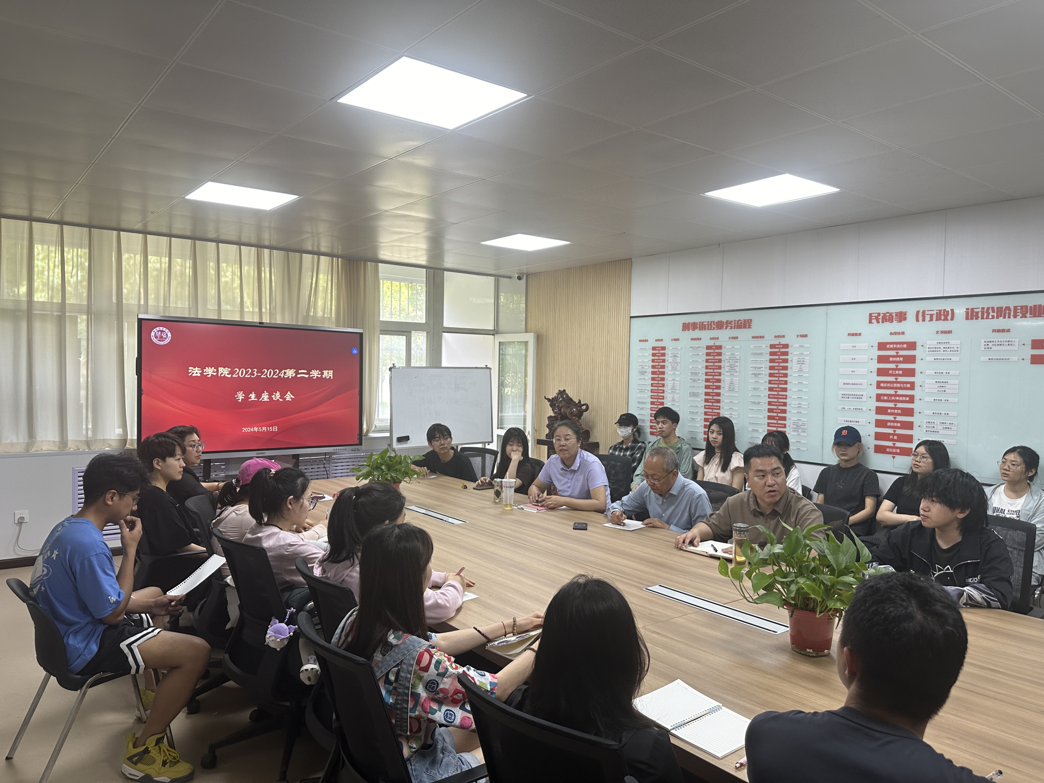 为深入了解学院教学工作情况,提高教学质量,法学院精心组织并于5月13日和5月15日分别召开了期中教学检查教师和学生座谈会。此次会议旨在听取师生对教学工作的意见和建议,共同探讨改进教学质量的策略和方法。法学院院长王鸿貌、党总支书记兼行政副院长韩斌、副院长赵洁、教师代表和学生代表参加了座谈会。