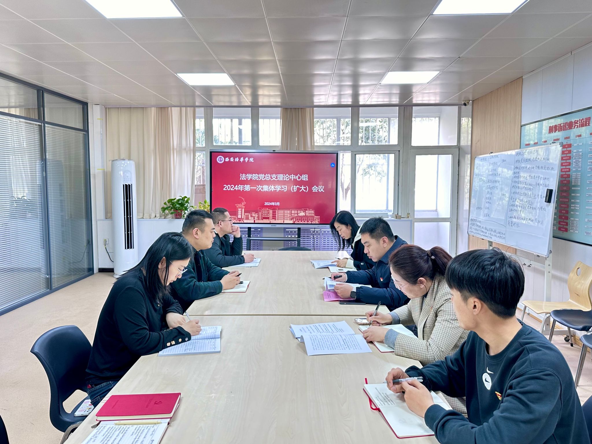 2024年3月19日下午,法学院党总支在格物楼1116办公室召开了学院党总支理论中心组学习(扩大)会议,集中学习了《习近平在中共中央政治局第十一次集体学习时的重要讲话》、《为高质量发展注入新动能、塑造新优势》、《习近平在参加江苏代表团审议时强调——因地制宜发展新质生产力》。学院党总支部委员、各支部书记、党务干事参加了学习,会议由院党总支书记韩斌主持。