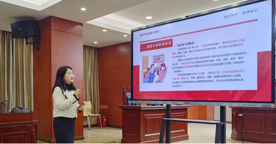 除了静态展示,学生们还邀请到了陕西华格律师事务所首席律师——陈丹律师举办了一场主题为“妇女权益保护实务分享”的公益讲座,吸引了近百名学生参加。讲座内容涉及婚姻财产权益、遭遇家暴如何应对、离婚损害赔偿、离婚家务劳动补偿以及子女抚养等方面的法律规定,旨在增强大学生的法治理念以及宣传妇女权益的保护。