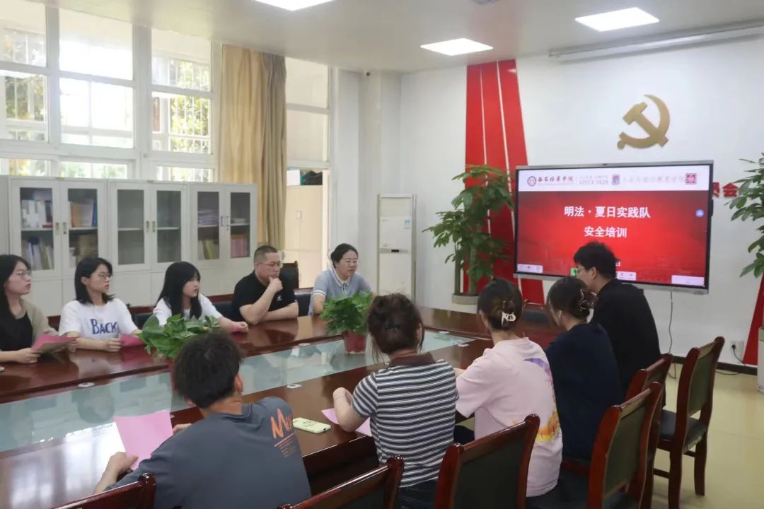 提高团队的专业能力,从而促进活动更好地开展,6月30日,明法·夏日实践队成员们一起走进萃泽律师事务所参观学习,并于7月4号在学校报告厅参加2023年暑期三下乡社会实践活动的授旗仪式。7月5日,团队指导老师赵洁、王朋、柴成华对实践队队员开展了安全主题教育增强队员的安全意识,为正式开展三下乡活动保驾护航! 普法宣传