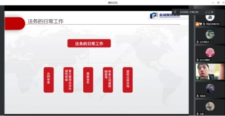 一个人职业的选择,是人生事业发展的起点,选择职业的正确与否,将直接关系到人生事业的成功和失败。职业生涯规划能够帮助青年人成才,是青年人成才的有效方法。确立目标,是职业生涯规划的重要内容。为进一步增强法学专业同学对未来职业的规划意识,了解更多职业发展社会背景,人文与国际教育学院法学系特邀请到盐城国投集团法务风控部主管李亮法务为主讲人,于2022年12月19日晚7点召开第三场法学专业职业生涯规划与就业指导系列讲座,法学专业21级全体学业导师及学生参加了本次讲座。在本次讲座中,李亮主管主要围绕法务的日常工作、法务的能力要求、学习规划等三个方面进行讲解。