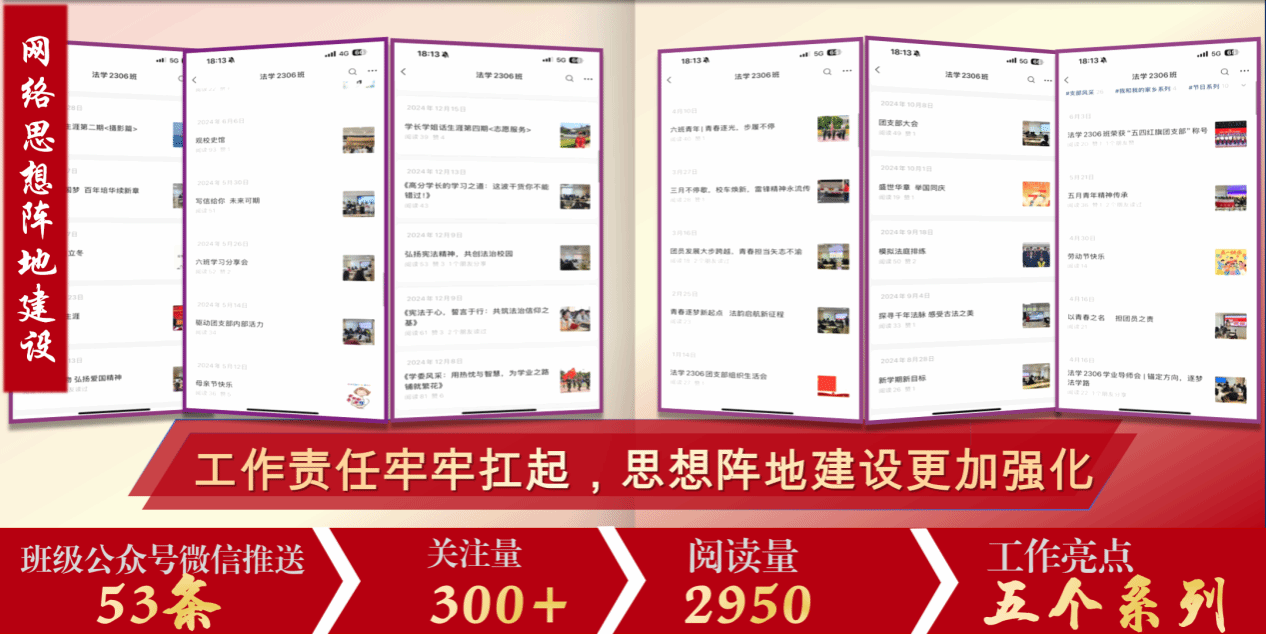 班级将理论学习与实践育人深度融合,2023年至今累计开展31次教育专题学习,参与率达100%。网络思想阵地建设成效显著,“节日”“学长制”等五大系列内容阅读量达2950次,班级参加组建的“九成法学”公众号发布89篇刑法案例分析,累计浏览量超2万人次,彰显法学生的专业担当和责任。