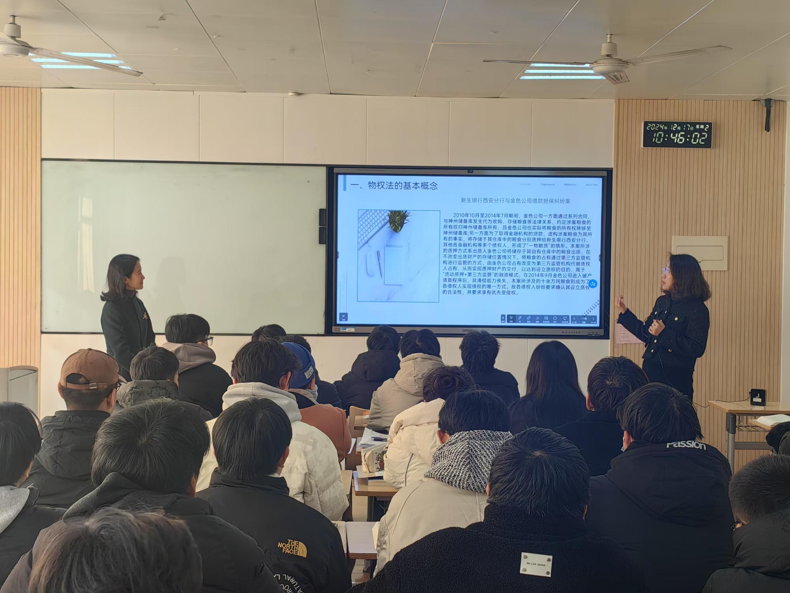 为进一步提升法学专业教学质量和学生实践能力,深化我校应用型课程改革,2024年12月17日上午,法学院开展了物权法课程“双师同堂”教学活动。本次活动,特邀陕西萃泽律师事务所陈默律师(律所创始合伙人),与私法教研室高燕老师进行了“双师同堂”模式授课,为法学2023级01班(学分制)和2023级02班(学分制)的学生,围绕物权法领域理论与实践共同展开教学。