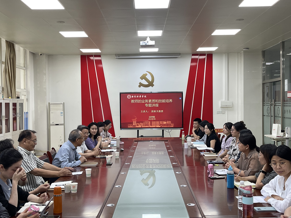 党的二十大指出,要提升教师教书育人能力,增强学生文明素养、社会责任和实践能力。高校应围绕习近平总书记关于好老师应具备理想信念、道德情操、扎实学识和仁爱之心的论述,培养高素质专业化教师队伍。基于党中央的精神,为了提升教师队伍专业水平,西安培华学院法学院于2024年5月15日15点30分在格物楼第四会议室举办了一场主题为“教师业务素质和技能培养”的专题讲座。本次讲座特邀原西北大学法学院院长段秋关教授主讲,西安培华学院法学院院长王鸿貌教授、法学院白呈明教授、魏春田教授与法学院全体专职教师一同参加了此次讲座。