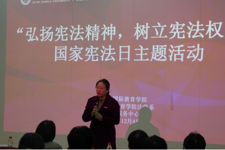 为了庆祝第十个国家宪法日,弘扬宪法精神,增强师生的宪法意识和法治观念,12月4日(星期一)早上9:00-10:00,人文与国际教育学院法学系在格物楼J101教室举办了以“宪法伴我们成长”为主题的国家宪法日活动。今年国家宪法日的活动主题是“大力弘扬宪法精神建设社会主义法治文化”。活动由法学系教师梁超老师主持,人文与国际教育学院教学副院长赵洁副教授、法学系教师钱豆老师以及法学系全体老师和学生参加了活动,此次活动由西安培华学院法律服务中心协办。