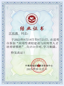 为深入学习全国教育大会精神,落实《国务院办公厅关于深化产教融合的若干意见》要求,深化课程改革,创新应用型人才培养模式,提高应用型人才培养质量积极推进应用型高校课程建设于2023年8月18日-2023年8月21日在昆明市召开突出应用型本科特色建设高水平应用型课程—应用型课程建设与应用型人才培养研修班。此次应用型课程建设与应用型人才培养研修班由中教国培创联教育咨询中心主办。我院法学系教师江欣燕、王蕾、袁姗姗、王悦老师参加此次培训会议。