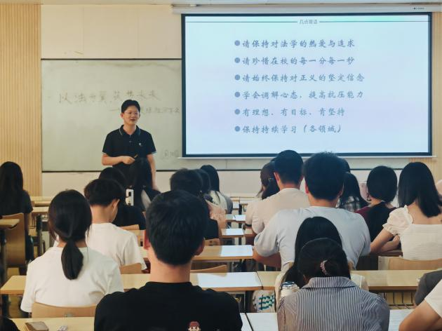 在分享的最后他倡议:“作为法学生,我们肩负着维护公正、守护法治的重任。在求知的路上,愿你们不忘初心,矢志不渝,将法律视为信仰,深植于心”。展望未来,他鼓励青年学子坚定信念、勇于担当,把所学知识转化为热情,投身法治社会建设,贡献自身力量。他寄望同学们成长为有高尚理想、优秀道德、强烈担当,兼备深厚专业素养与扎实实践能力的复合型高素质法律人才。