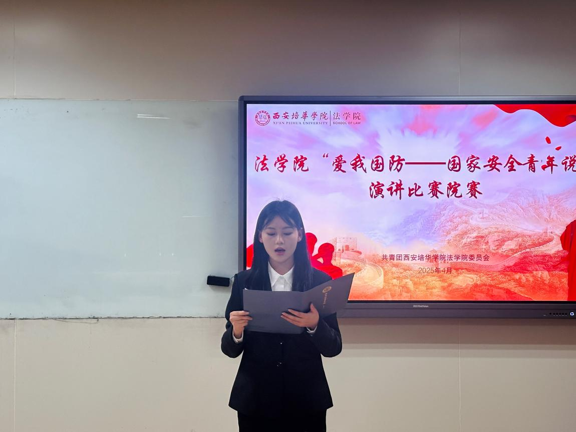 比赛现场,参赛选手紧扣“国家安全”主题,从历史纵深、时代使命、法治实践、青年责任等多元视角展开演讲。比赛现场气氛热烈,参赛选手们结合自身的学习生活实际,用生动的语言、鲜活的事例和真挚的情感,从多个角度阐述了对国防建设的深刻理解与感悟,展现了法学学子“知国安、懂国安、护国安”的扎实素养。