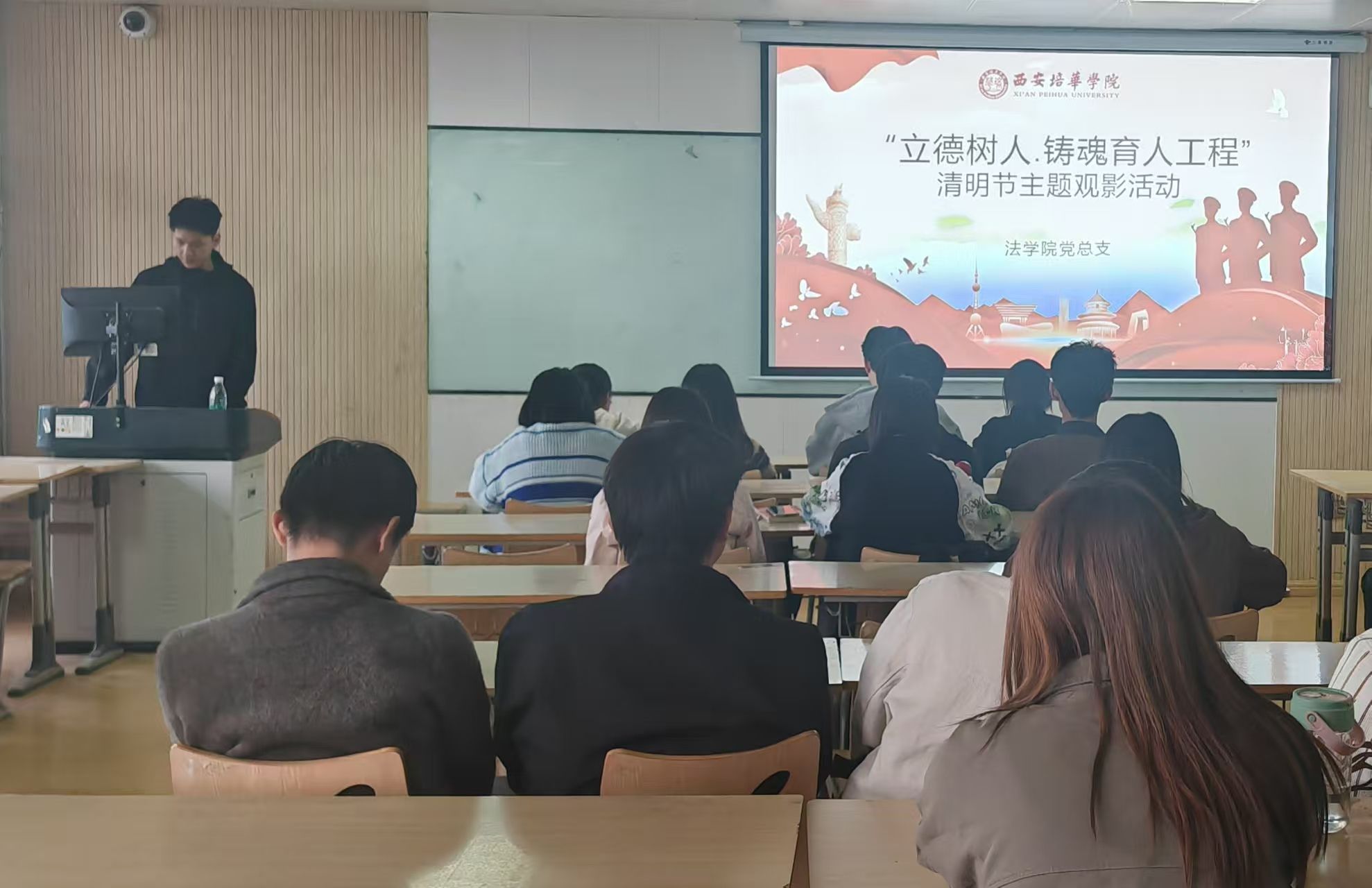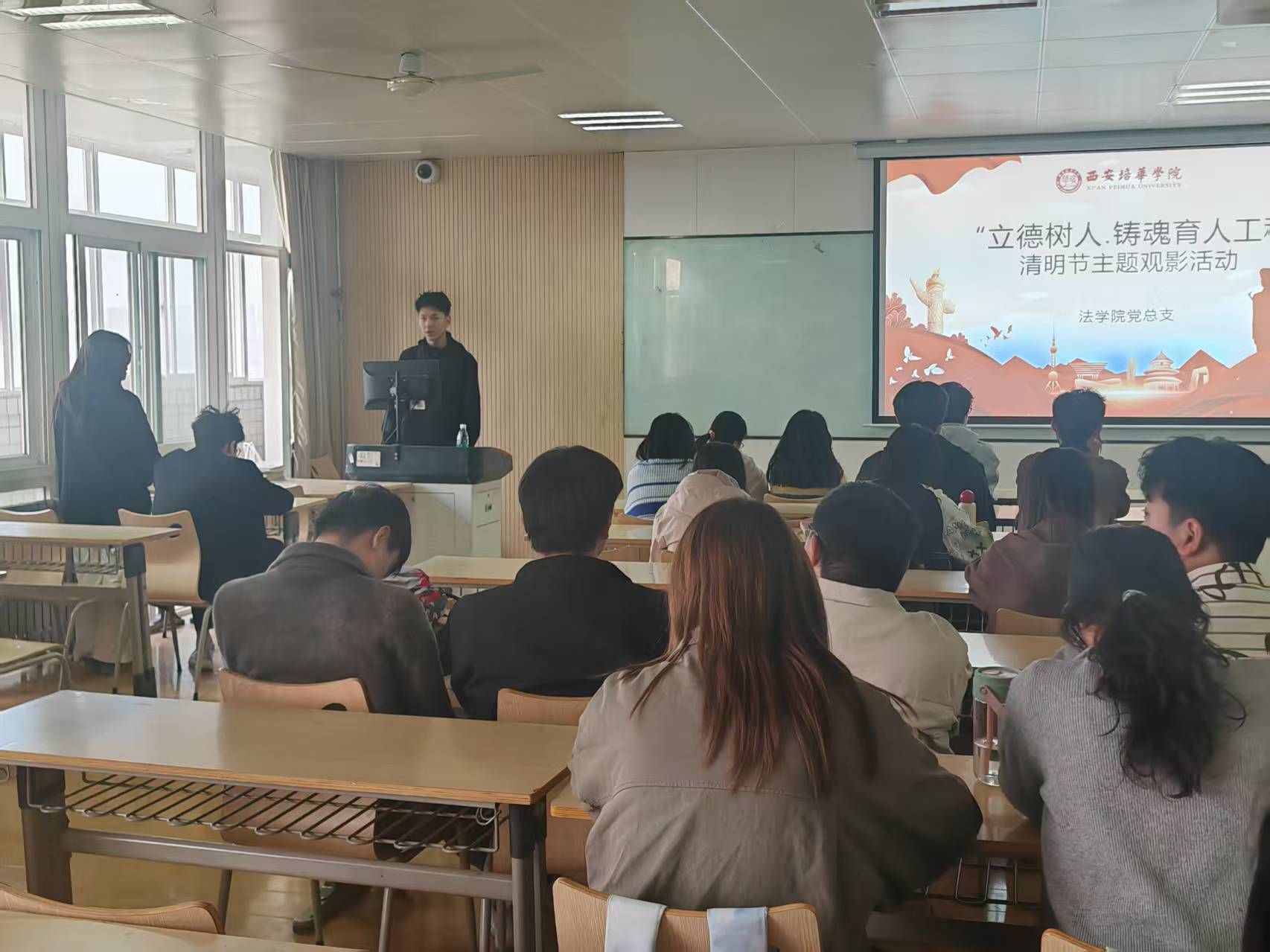 为引导学生缅怀革命先烈,弘扬爱国主义精神,积极践行社会主义核心价值观、传承红色基因的浓厚氛围,使文化沁润教育,法学院党总支开展了“立德树人·铸魂育人工程”系列教育实践活动。2025年4月2日18:00,法学院党总支组织51期入党积极分子在2616教室开展清明节爱国主义主题观影活动。