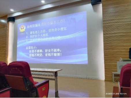 接着,刘洋警官详细分析了大学生中常见的六种诈骗,分别是:校园贷诈骗、兼职诈骗、网购诈骗、恋爱诈骗、中奖诈骗、募捐诈骗。他用真实的案例和数据,揭示了这些诈骗的手法和危害,教育同学们要理性消费,慎重选择,谨慎交友,理智判断,自觉抵制,积极举报。