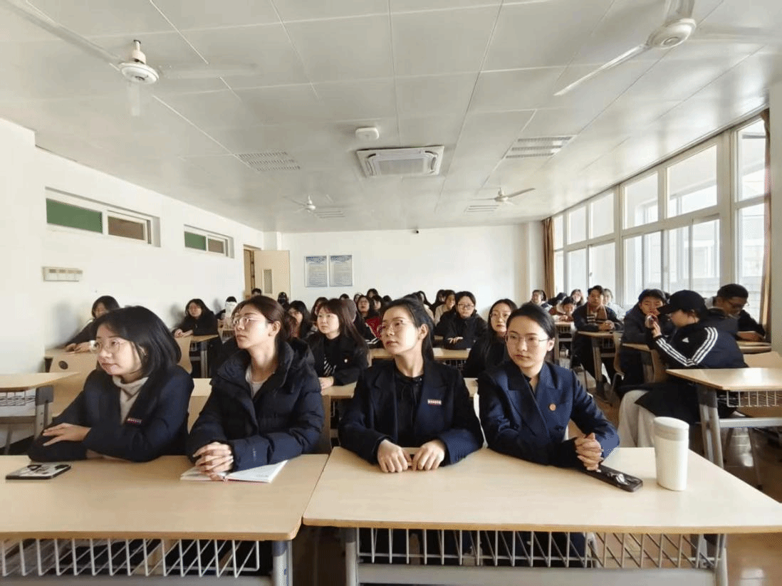 随后,法律实务教研室教师王庆昱带领全体师生进行宪法专题学习。她结合法治实践与法学理论,深入浅出地阐释了宪法的核心要义、发展历程及时代价值,引导师生深刻理解宪法作为国家根本法的权威与地位,强调了宪法在治国理政中的重要作用。